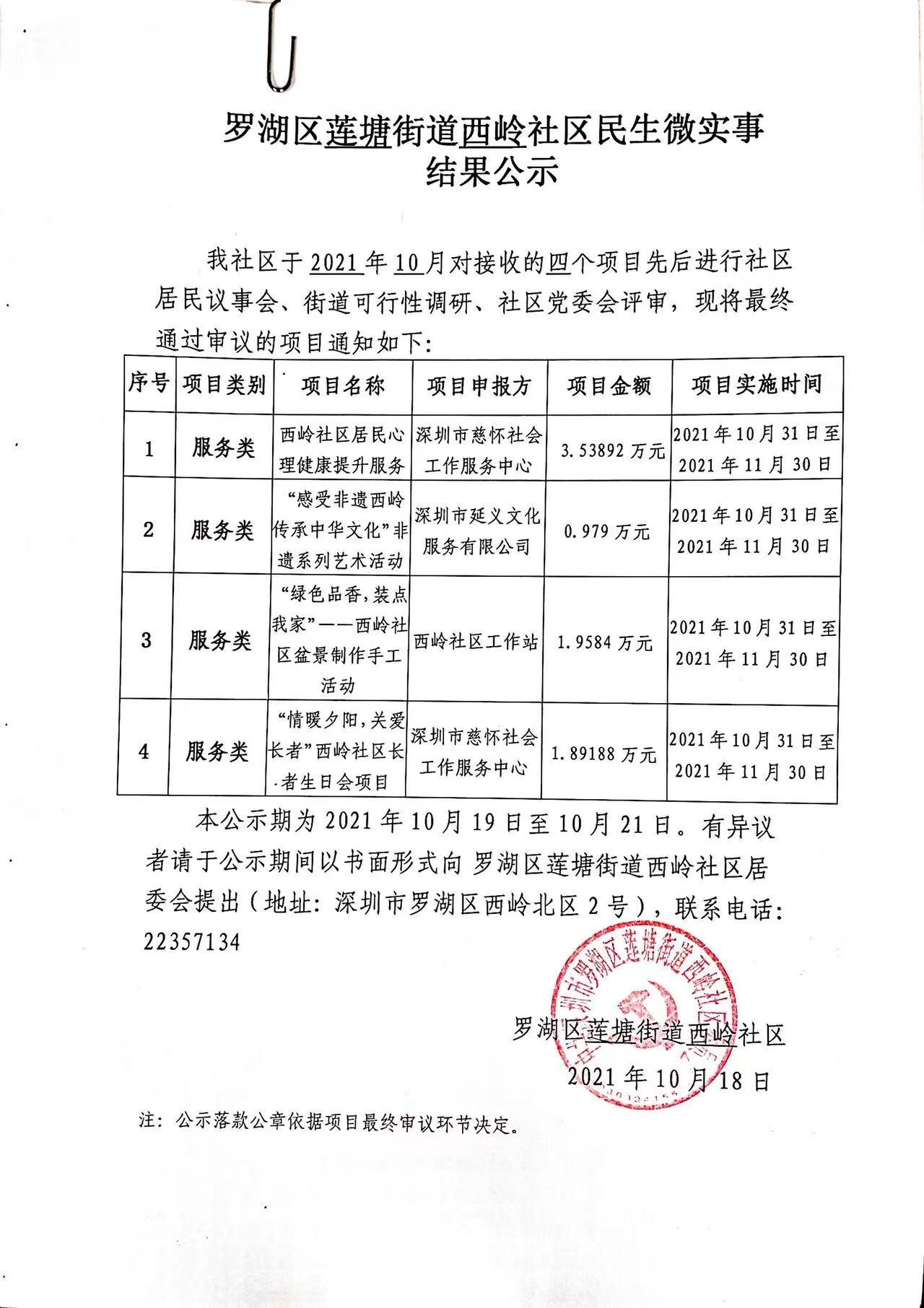 罗湖区莲塘街道西岭社区民生微实事结果公示