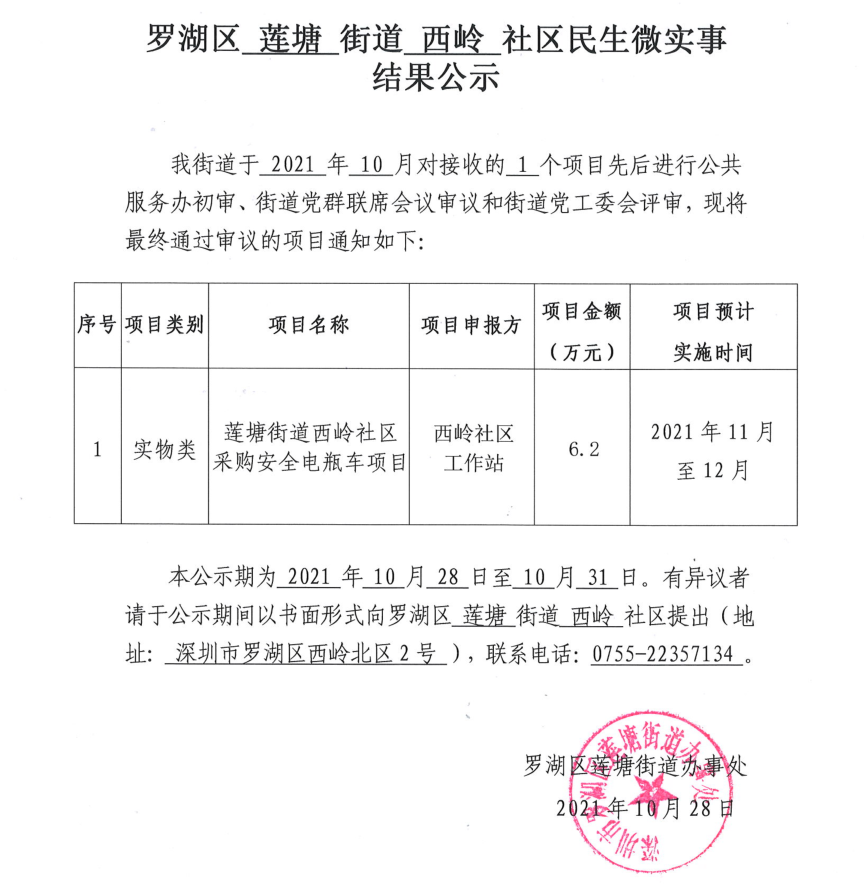 罗湖区莲塘街道西岭社区民生微实事结果公示