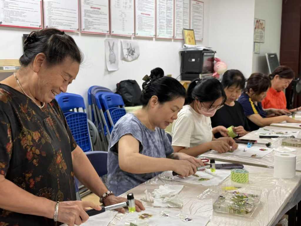 活动现场,社工通过生动讲解和示范,向居民介绍植物拓染的原理与技巧。从植物的选择、布局到敲击的力度和节奏,都进行了细致讲解。居民们纷纷发挥创意,挑选自己喜爱的树叶、花瓣,精心排列在方巾上。随后,手持锤子轻轻敲打,让植物的汁液慢慢渗透进方巾纤维,留下独一无二的自然印记。大家一边制作,一边交流心得,现场气氛热烈而温馨。不一会儿,原本素净的方巾上绽放出了五彩斑斓的图案,有娇艳的花朵、翠绿的枝叶,每一件作品都充满了自然的气息和独特的艺术魅力。