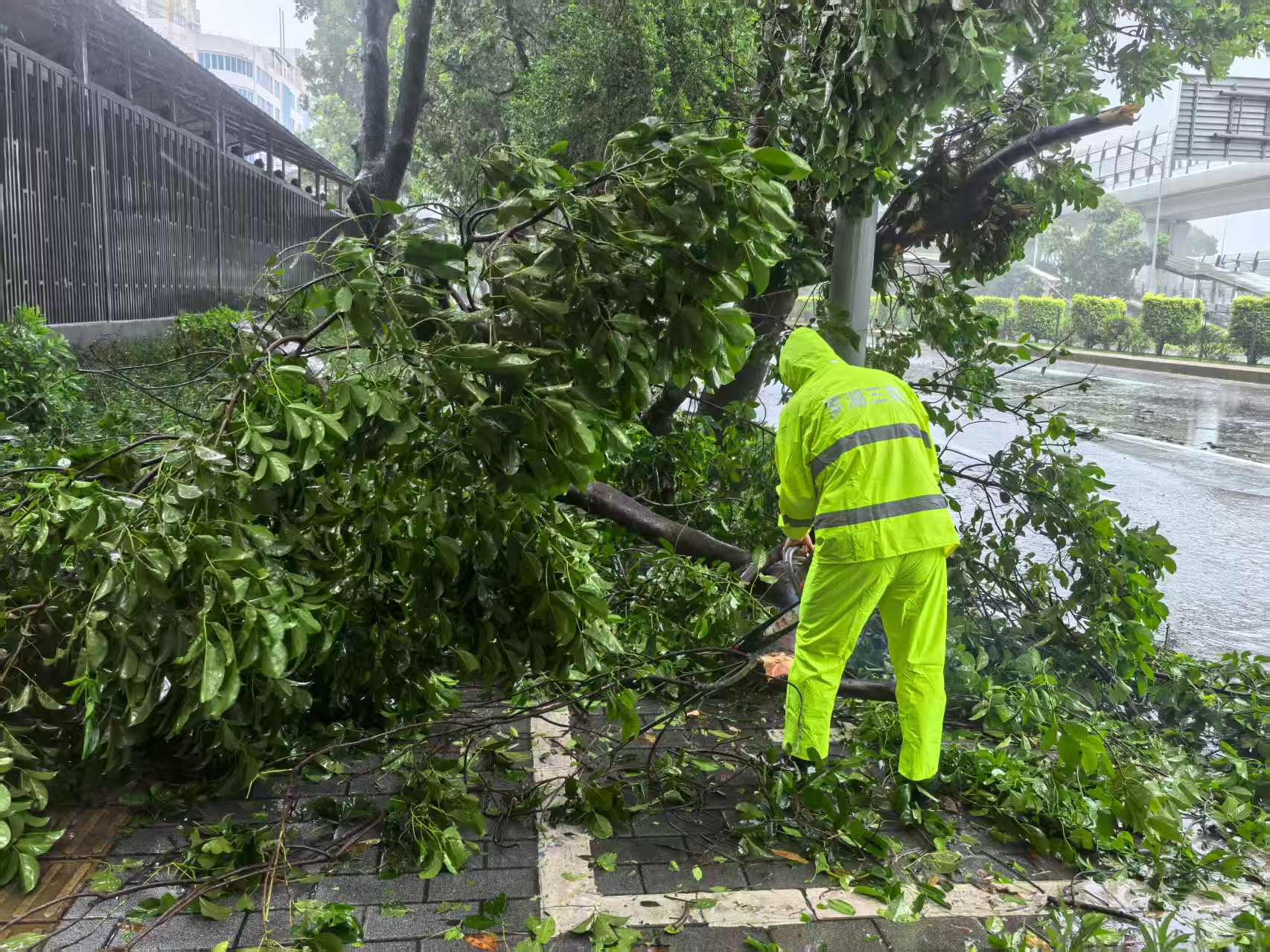 2025年9月24日受超强台风“桦加沙”的 影响,西岭社区罗沙路两边部分树木发生倾斜倒伏,断枝散落一地,现场一片狼藉,影响交通出行且存在安全隐患,社区党委书记张晓东带领工作人员在保障自身安全的情况下迅速奔赴现场。