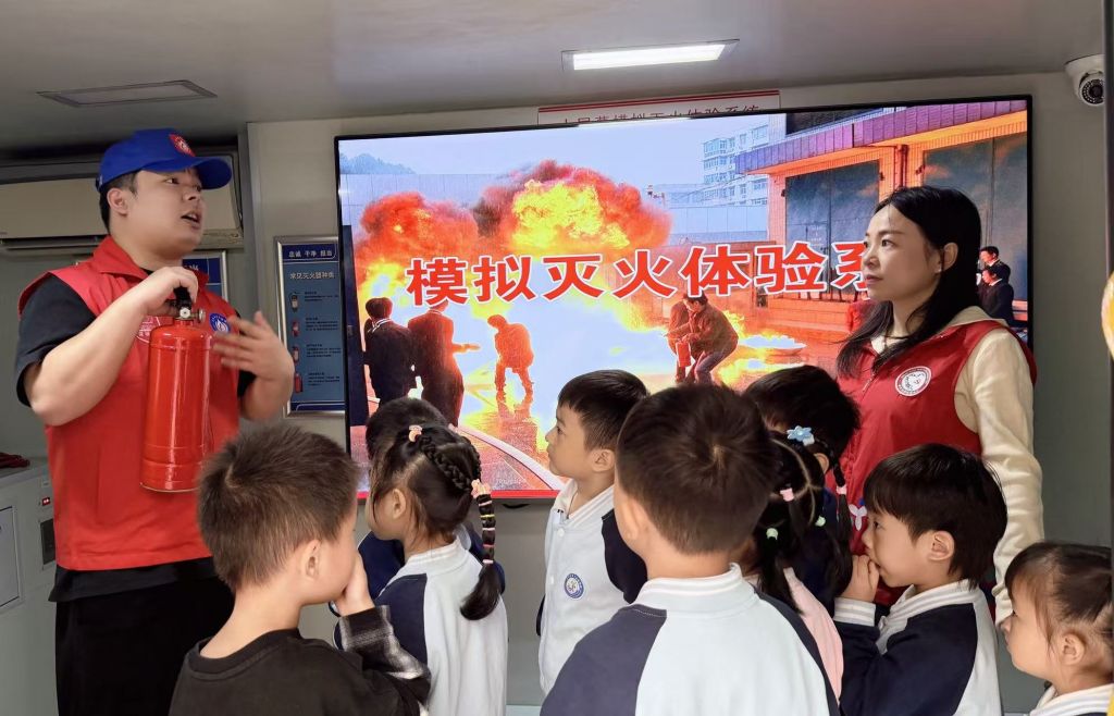 消防大队带来的双层消防车备受瞩目。消防员打开装备舱,带孩子们进车亲身体验,并生动的介绍与实物展示,详细讲解消防装备的用途。现场还演示灭火器“提、拔、握、压”操作,让孩子们直观了解消防工具,不少孩子主动触摸,充满好奇。