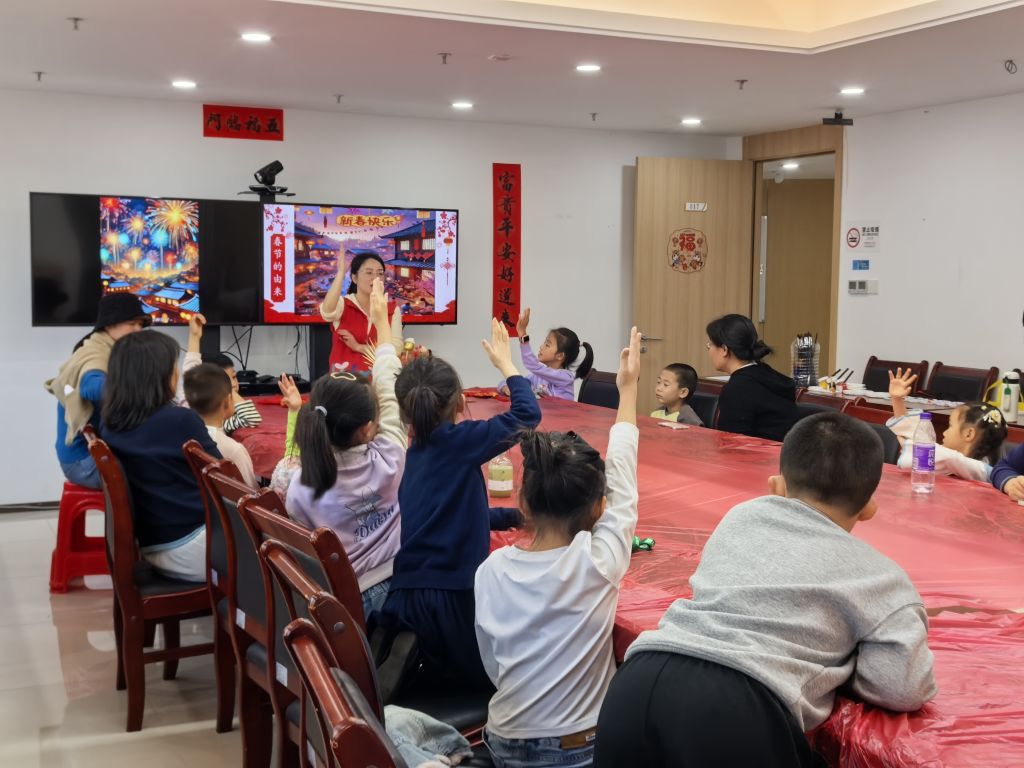 活动伊始,欢快的旋律《福气要来到》响起,孩子们在社工的引导下跳起灵动的课桌舞,瞬间点燃现场氛围。随后,大家共同欣赏《新年的由来》故事视频,生动的画面与通俗的讲解,带大家探寻“除夕驱邪”“团圆守岁”的文化根脉,让传统年俗知识深入人心。创意绘画环节成为活动亮点,社区为参与者准备了丙烯、画笔、画纸及吉祥元素素材。以红灯笼等元素融入画作,在斑斓色彩的画纸上绽放,每一笔都承载着对新年的美好期许。