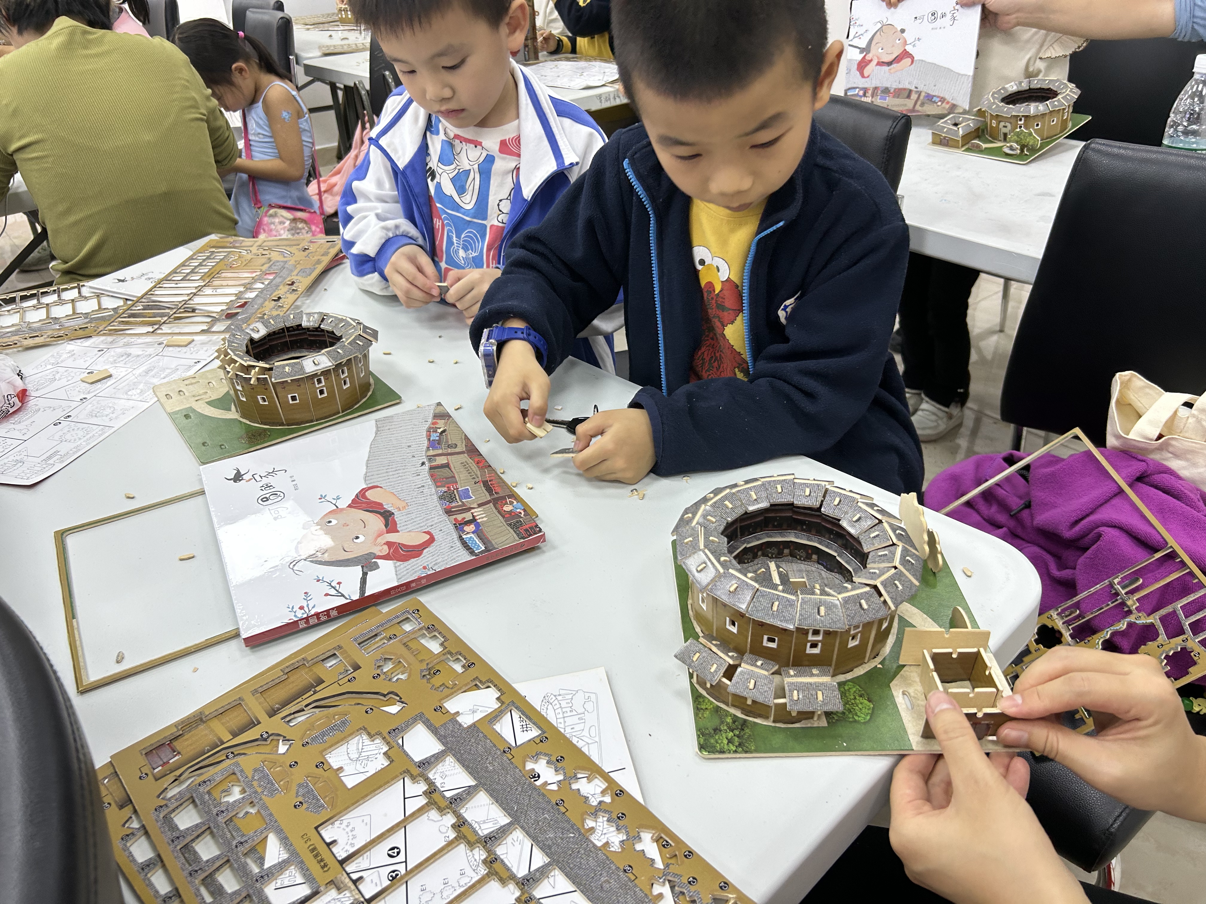 主讲老师用一首客家童谣《排排坐》带领参与者们了解了客家人的语言特点,通过“猜猜这是谁的家”互动游戏,让参与者们了解到自然界动物的居住环境,把话题带入活动主题《阿圆的家》。书中以客家小女孩阿园和小燕子为主角,以追花生为线索,探讨友情和故乡议题的童趣故事。深圳是客家人的主要聚居地之一,本次活动通过客家童谣带领孩子们了解客家文化,在活动交流互动中带领儿童青少年了解中国深厚的“家”文化。活动延续手工制作客家土楼,寓教于乐,弘扬“家”文化,同时享受手工带来的乐趣。