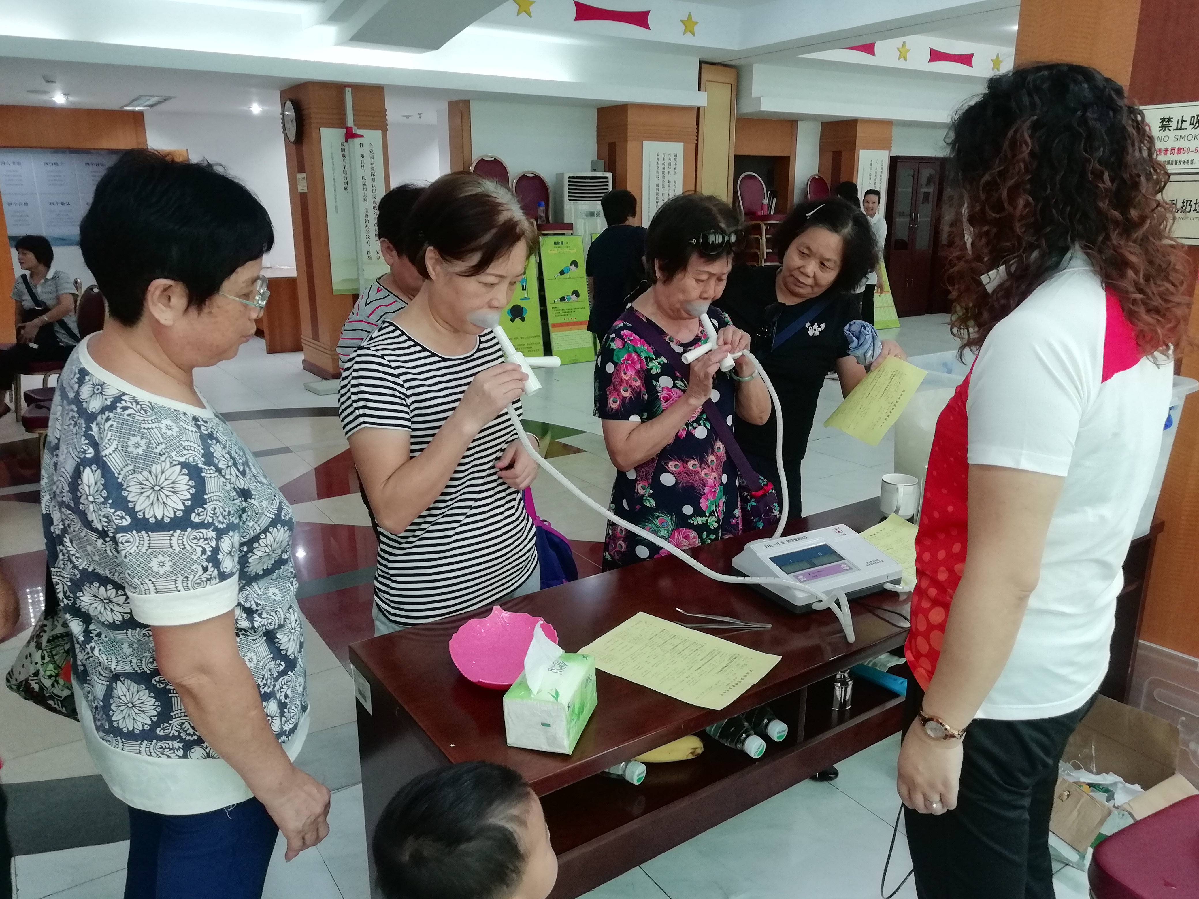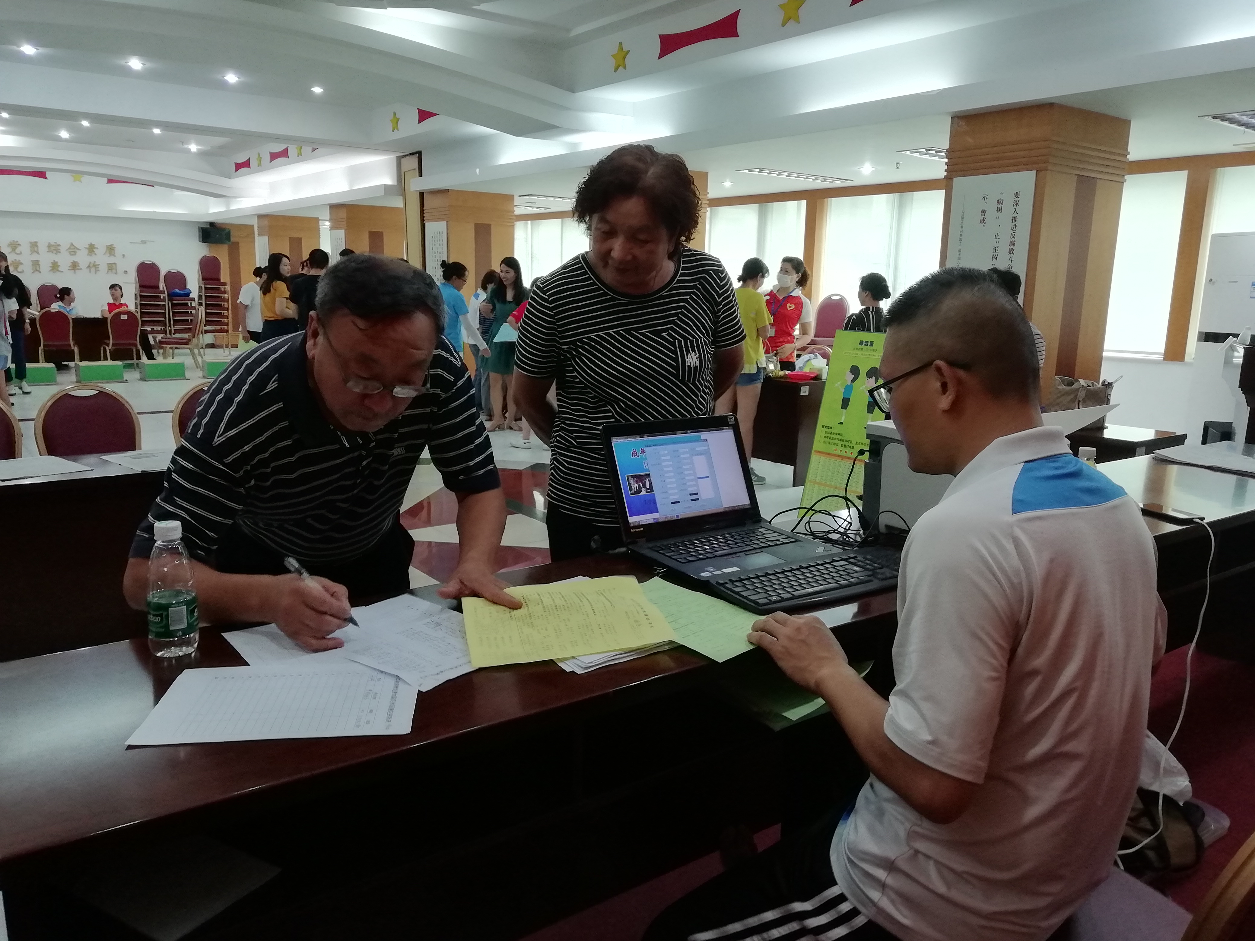 活动现场,气氛活跃,居民们有序的对照体侧表进行体侧,内容包含测量身高、体重、肺活量、握力、闭眼单脚站立、坐位体前屈、台阶测试等多个项目。