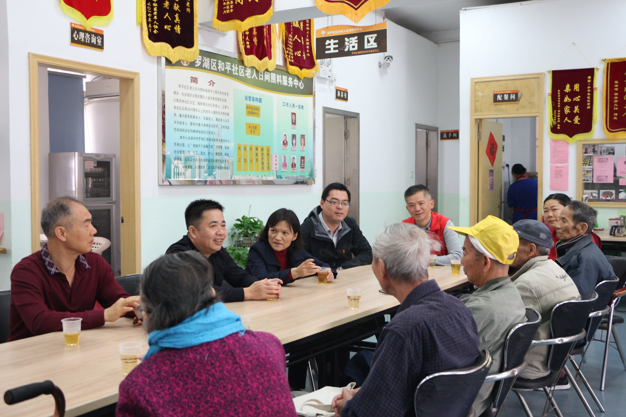 和平社区讯 2019.12.23日上午,罗湖区民政局杨文秀局长、许伟康调研员到和平社区老年人日间照料中心走访调研,听取社区长者心声和需求,以及日间照料中心对长者管理服务的意见和建议。