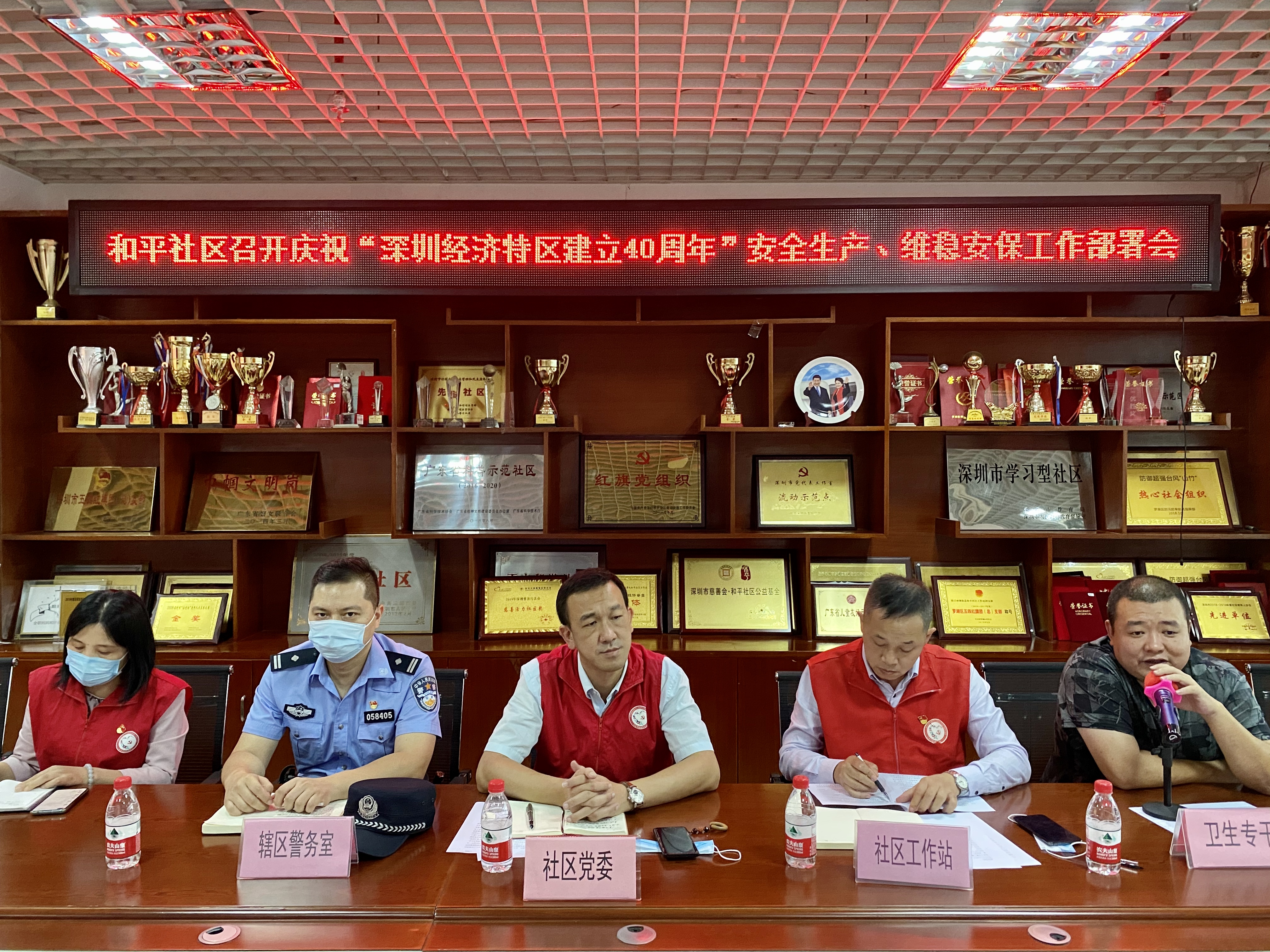 和平社区讯 10月12日下午,和平社区党委牵头召开了庆祝“深圳经济特区建立40周年”安全生产、维稳安保工作部署会暨10月份基层综合治理分析会。社区党委书记、工作站站长姜德荣同志,海关社区警务室警长梁宁同志以及社区安全、卫生专干,城区治理办,社区重点企业、物业公司、作业单位代表等共同参与,会议由和平社区党委副书记、工作站副站长陈少斌同志主持。