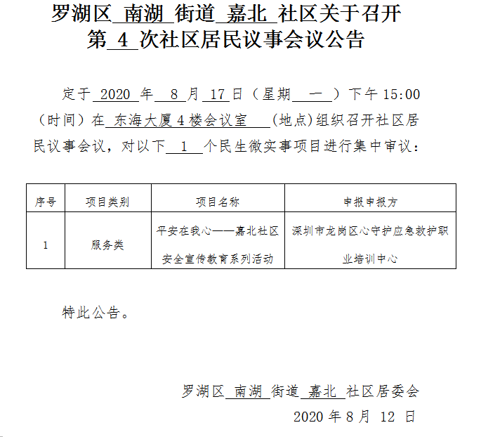 罗湖区南湖街道嘉北社区关于召开第 4 次社区居民议事会议公告