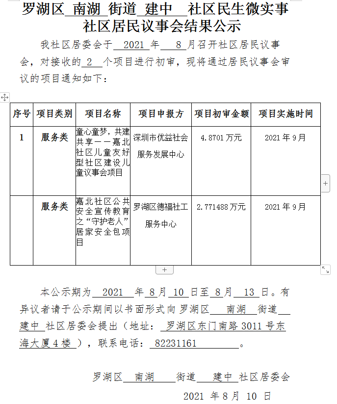 罗湖区 南湖 街道 建中 社区民生微实事社区居民议事会结果公示