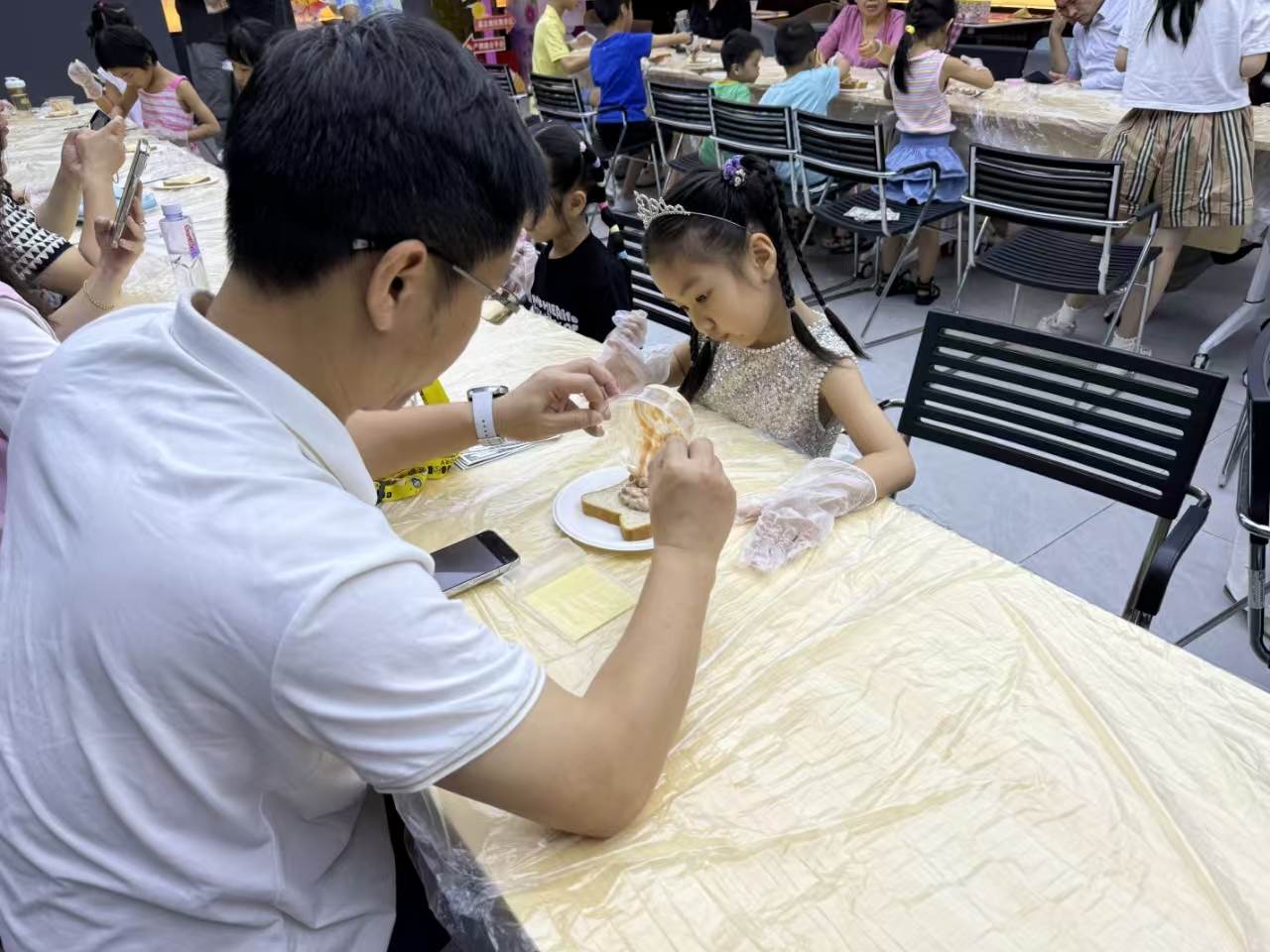 英语趣味课堂结束后,备受期待的手工 DIY 三明治环节闪亮登场。大朋友素养活动中心的老师们提前准备好了新鲜丰富的食材,有松软的面包、鲜嫩的肉饼、软糯的黄豆、和香浓的芝士片等。在老师们的耐心指导下,孩子们和家长们齐上阵,共同开启了一场美食创作之旅。