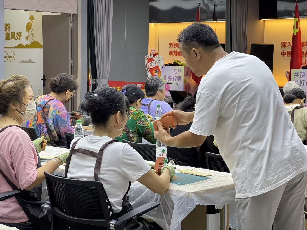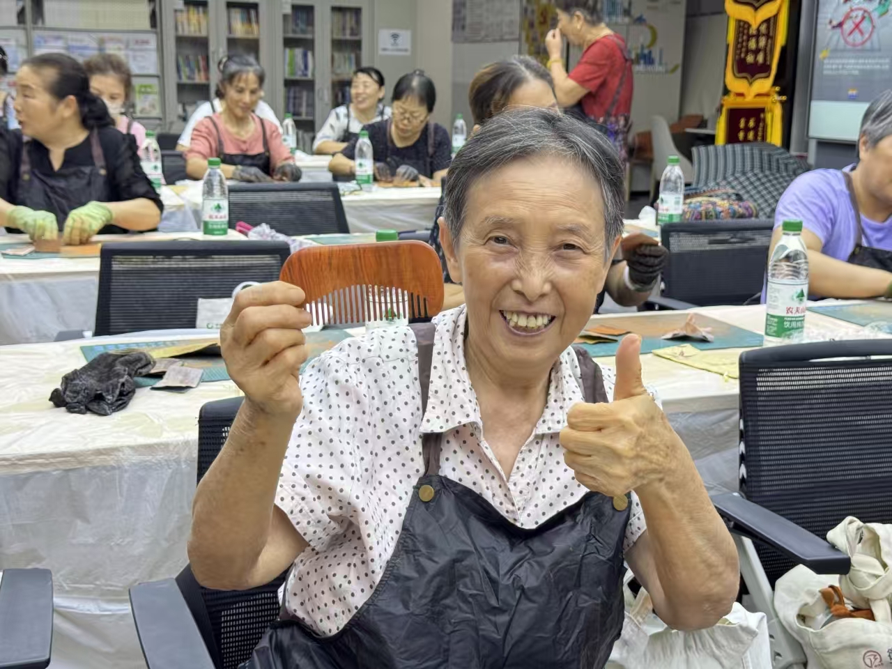 当温润的红木梳子在掌心成型,阿姨们互相欣赏彼此作品,交流打磨技巧与生活趣事。张老师特别提醒:“红木梳子日常使用时用软布擦拭即可,越养越有包浆,就像咱们的情谊一样历久弥新。”活动尾声,社区为每人赠送木梳袋,方便大家将这份手作心意传递给亲友。