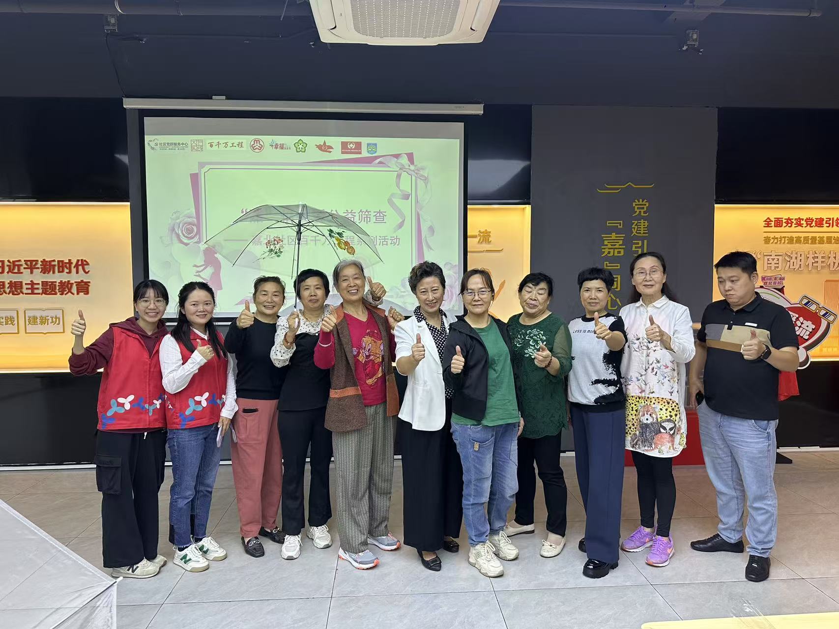 为缓解居民筛查时的紧张情绪,活动特别设置绘画雨伞手工环节。社工提前备好空白雨伞、颜料、画笔等材料,引导大家发挥创意创作,还主动带动氛围,鼓励居民交流绘画技巧、分享生活趣事。原本严肃的筛查现场,变成邻里姐妹互动的温馨 “小天地”,不少居民表示:“这一上午不仅查了健康,还认识了新朋友,特别暖心。”