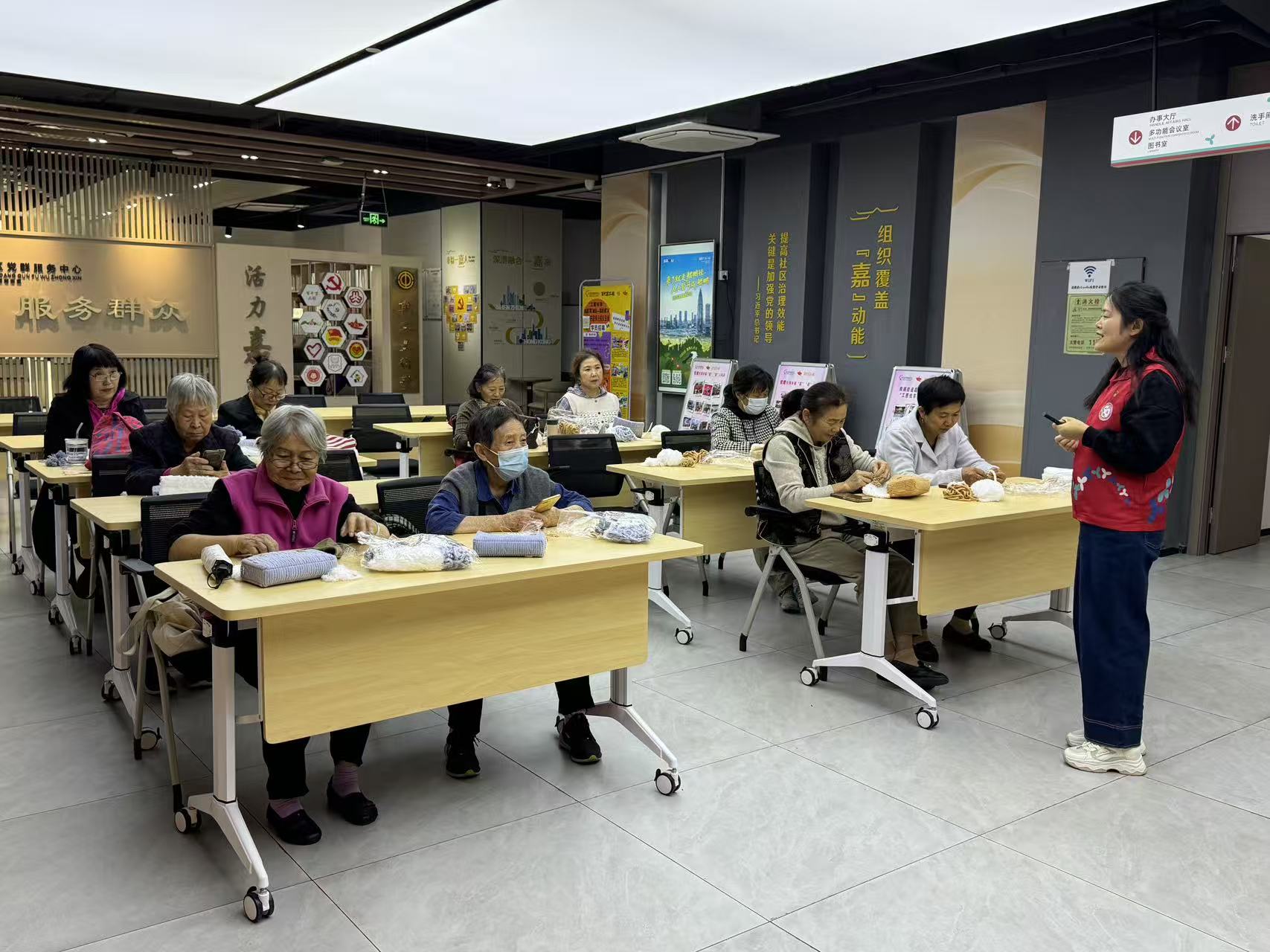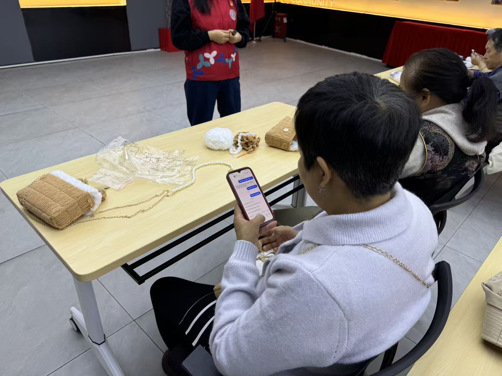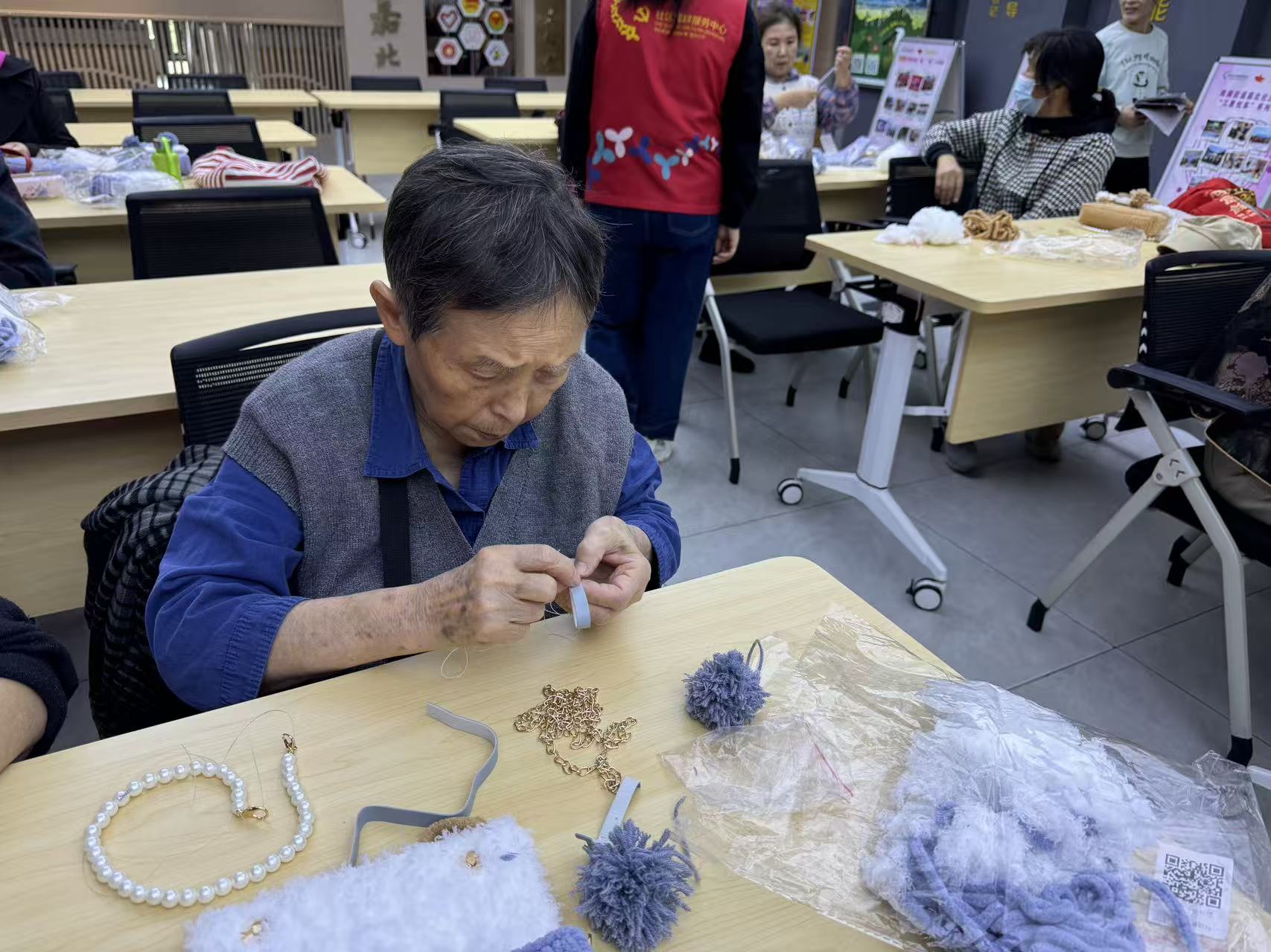 与此同时,手工包包编织活动也同步进行。进度较快的组员已自豪地完成了作品,而稍慢一些的组员则在社工和同伴的帮助下,认真进行饰品缝制和最后的收尾工作。大家互相欣赏、彼此鼓励,手中编织的不仅是包包,更是满满的成就感与邻里情。