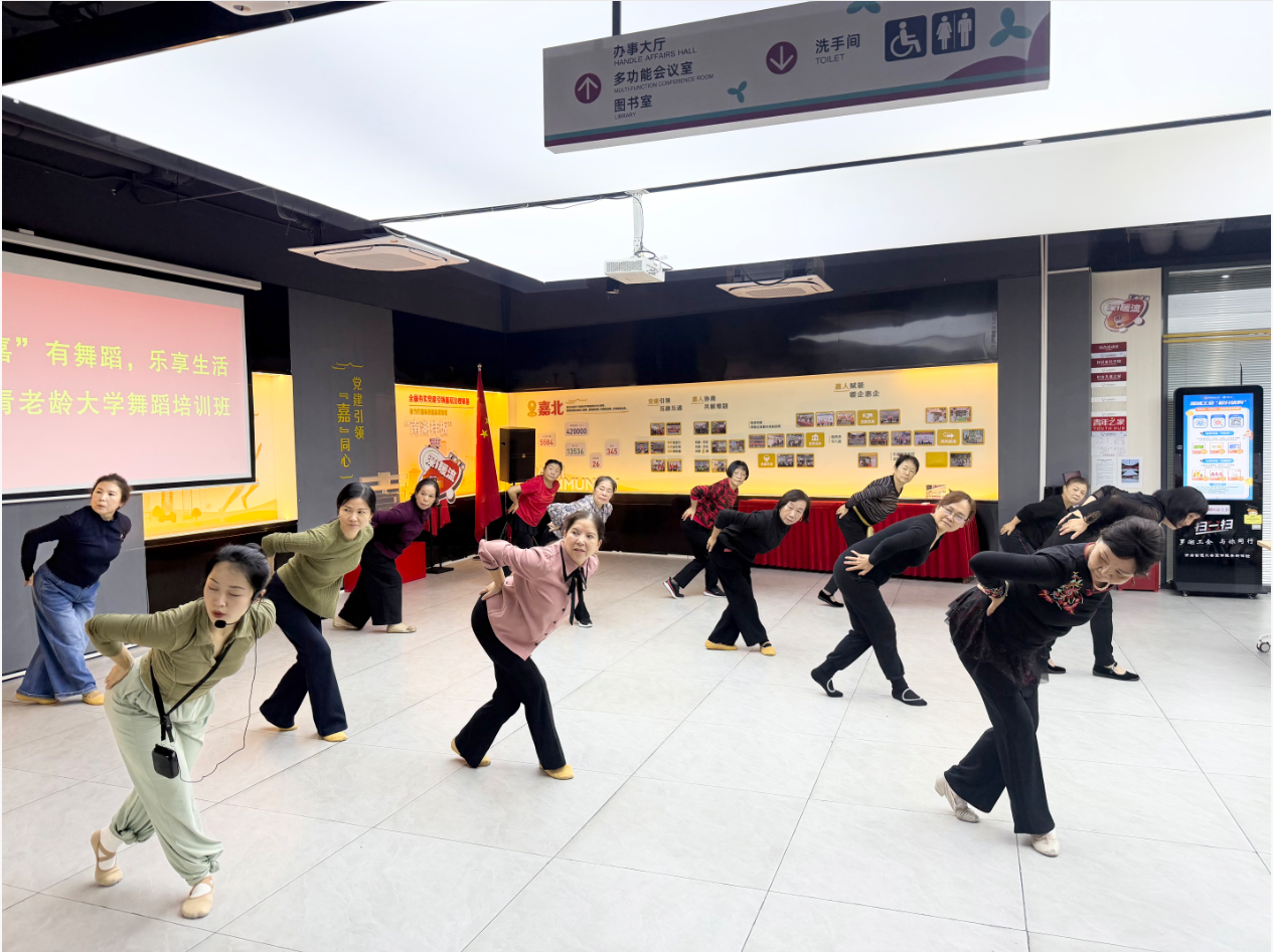 嘉北社区长青老龄大学舞蹈班自开班以来,持续受到老年居民的欢迎与好评。课程不仅丰富了大家的业余生活,也为社区居民提供了交流互动、提升自我的平台。许多学员表示,在舞蹈中感受到了身心愉悦与社区归属感。