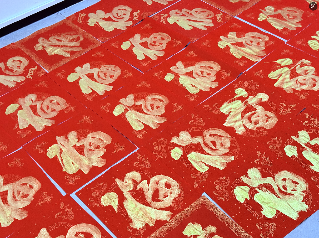 活动现场,刘道香先生展纸挥毫,精心创作。一幅幅寓意祥瑞的春联笔力遒劲,一个个饱满的“福”字在金色与墨色的交融中熠熠生辉,尽显书法艺术的独特魅力与深厚底蕴,为社区带来了浓厚的文化年味。