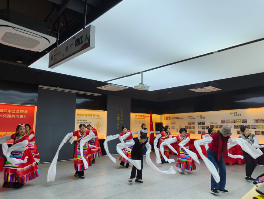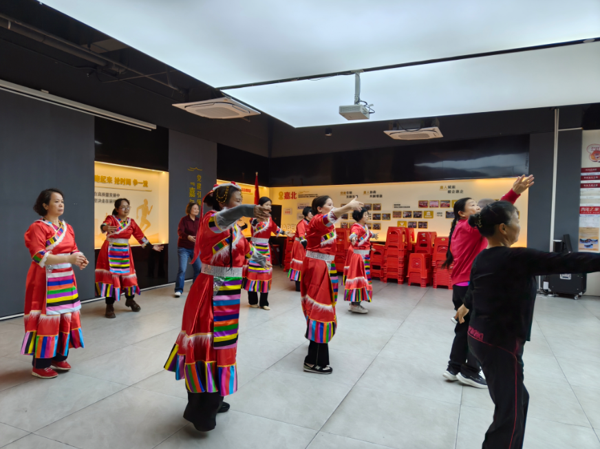 罗湖家园网讯:2026年1月30日上午,嘉北社区党群服务中心活动室内洋溢着节庆般的喜悦氛围。随着悠扬的藏族音乐缓缓响起,长青老龄大学舞蹈班迎来了本学期的最后一课。特别的是,今日全体学员身着精美的藏族传统舞蹈服装——五彩长袖随乐飘动,在流光溢彩中共同完成了一场温情而庄重的结课展演。