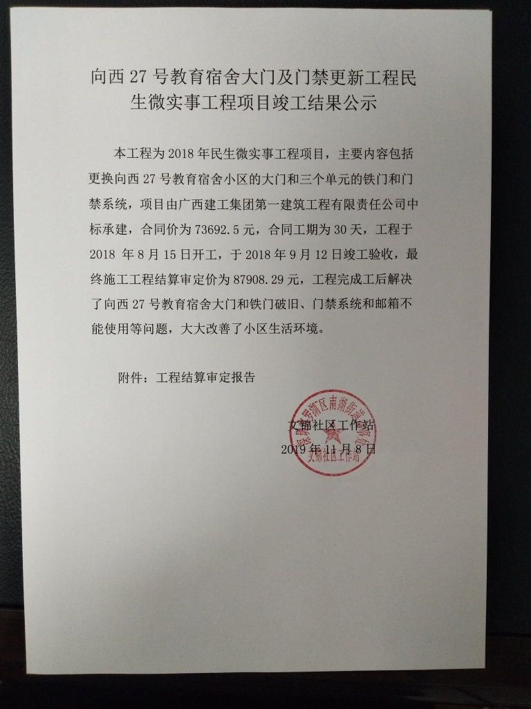 向西27号教育宿舍大门及门禁更新工程项目竣工结果公示