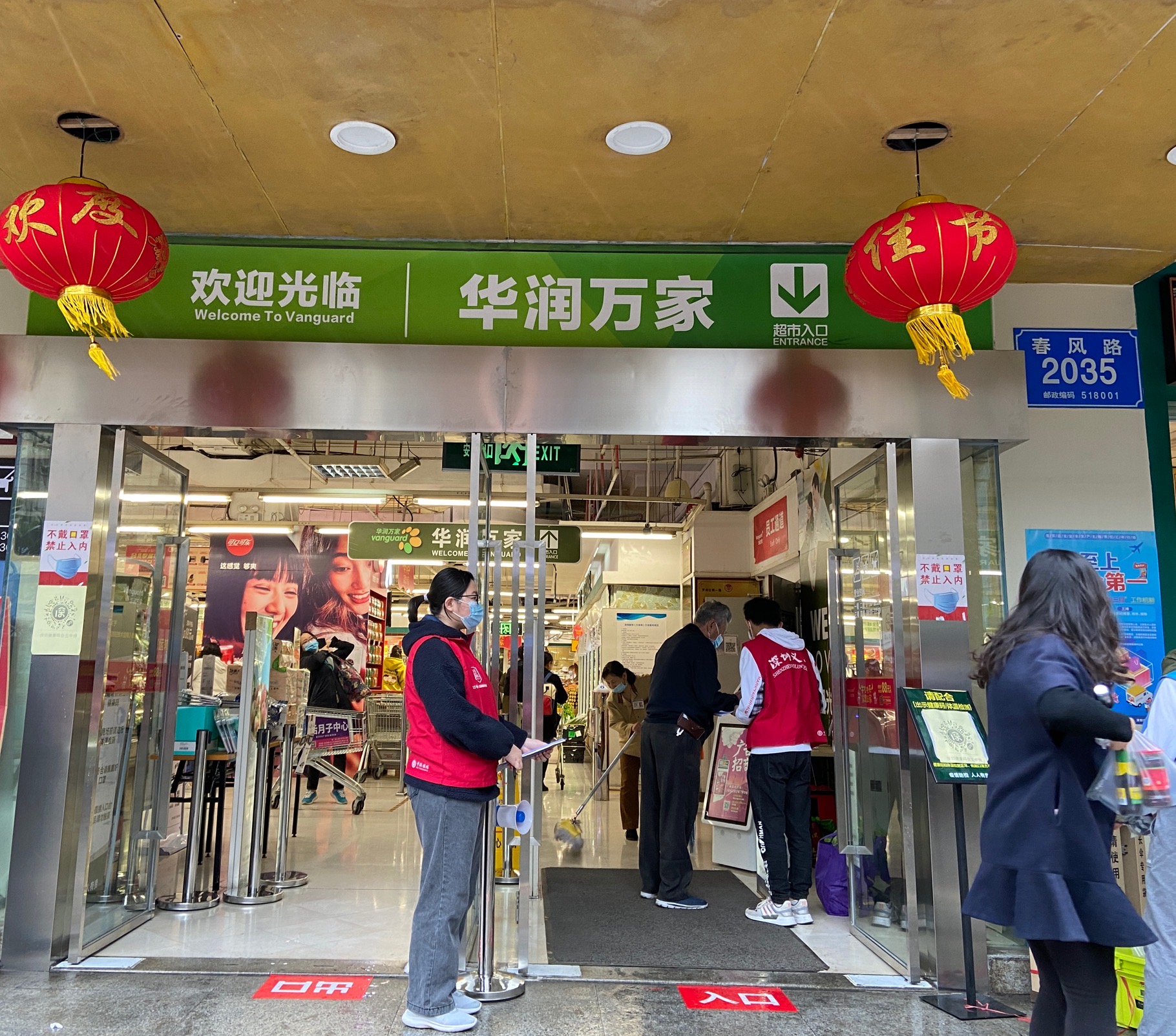 文锦社区志愿者在万家超市入口处协助扫健康码、测体温