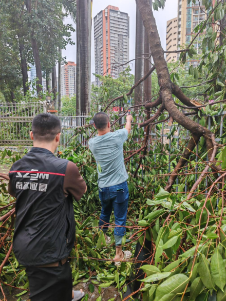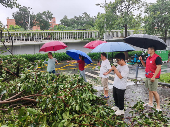社区工作人员昼夜奋战:排查老旧房屋安全隐患,协助低洼地段居民转移,加固易倒伏设施。在文锦中学临时安置点,工作人员为转移群众分发物资、安抚情绪;在文锦南路清障现场,众人合力移开断枝残木,快速恢复道路通行。雨幕中的荧光绿马甲与闪耀的党徽交相辉映,凝聚成抗击台风的温暖力量。