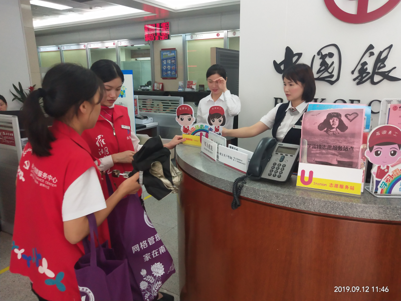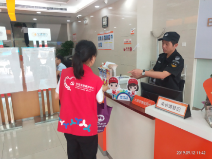 新南社区工作人员派送志愿者标识给辖区银行网点。
