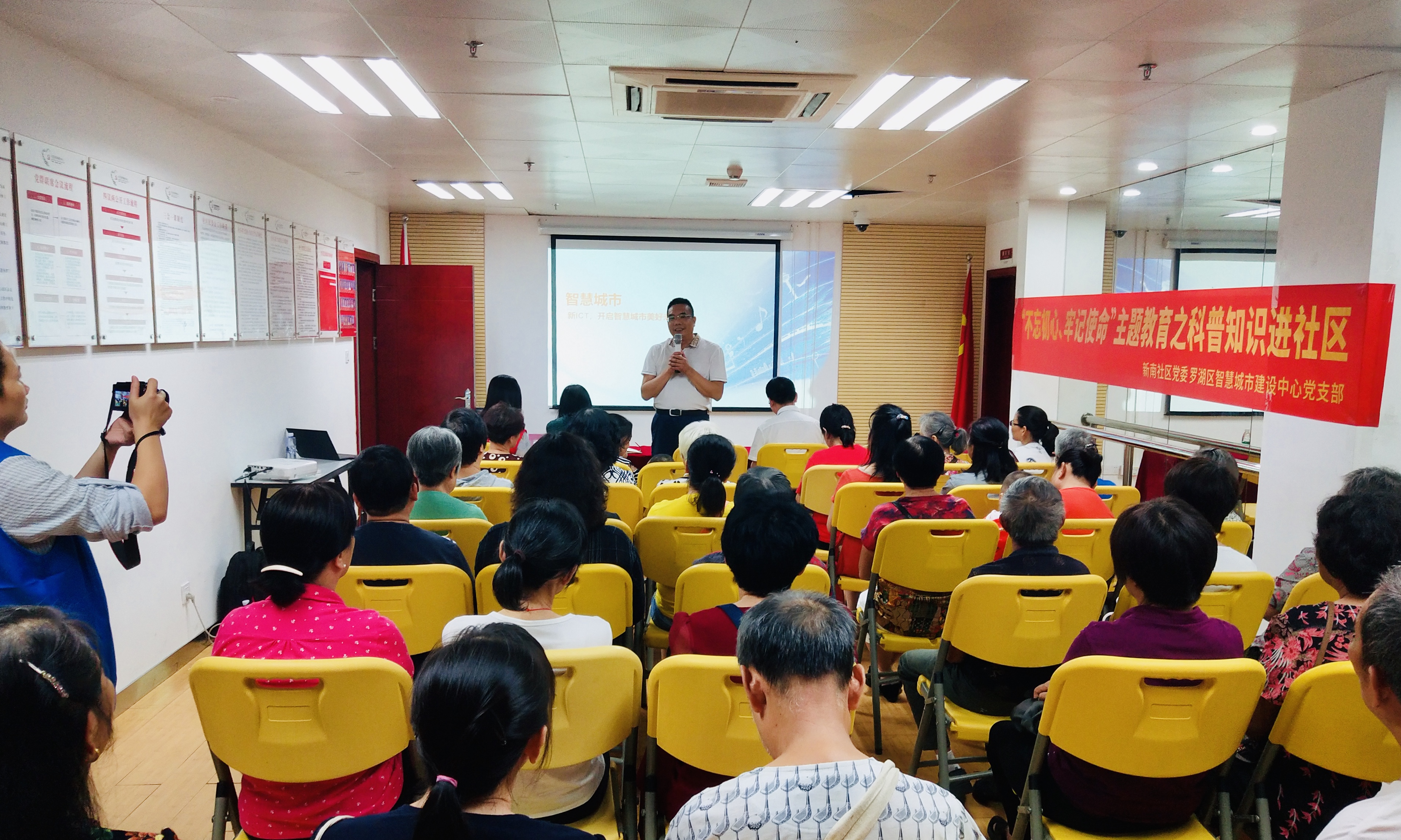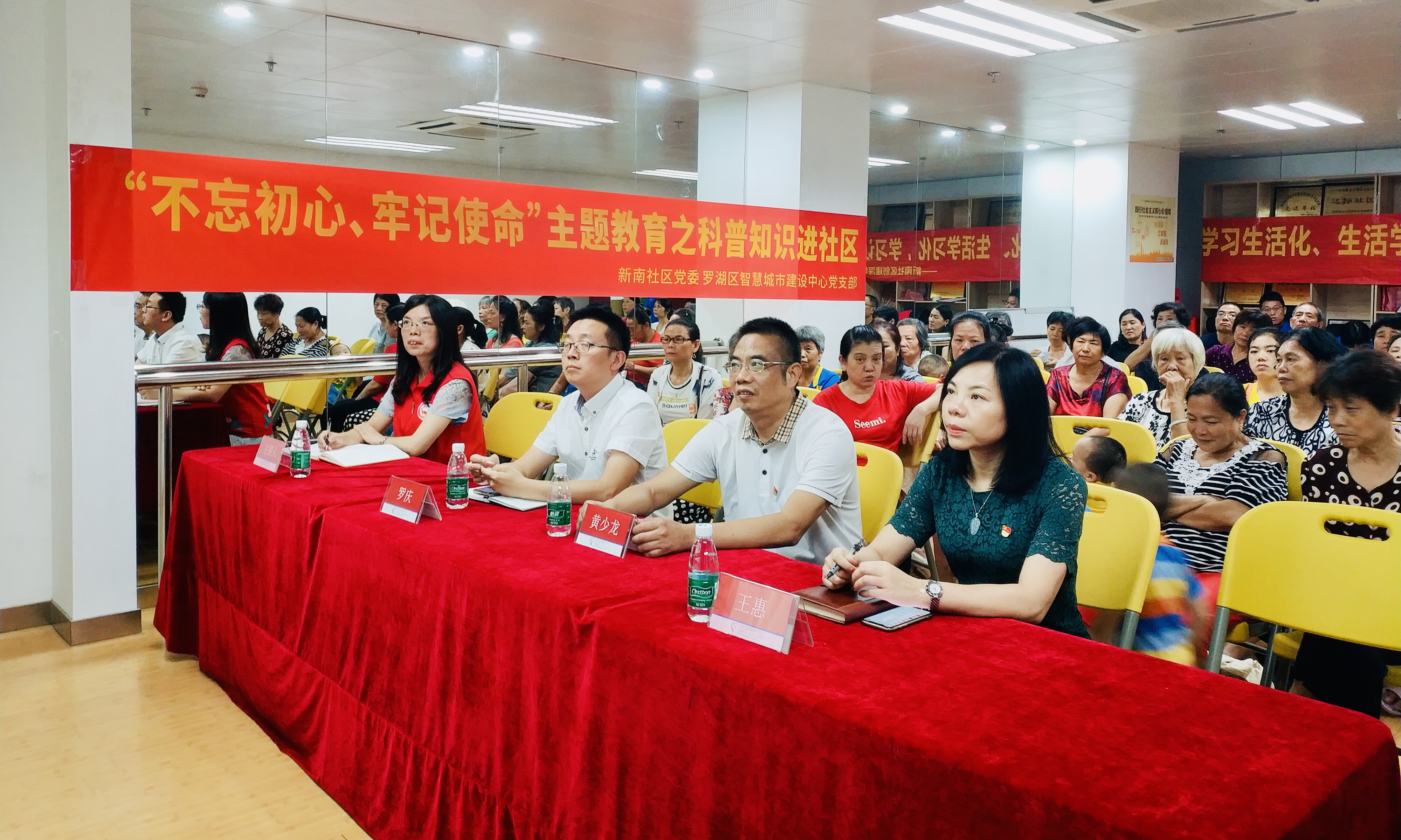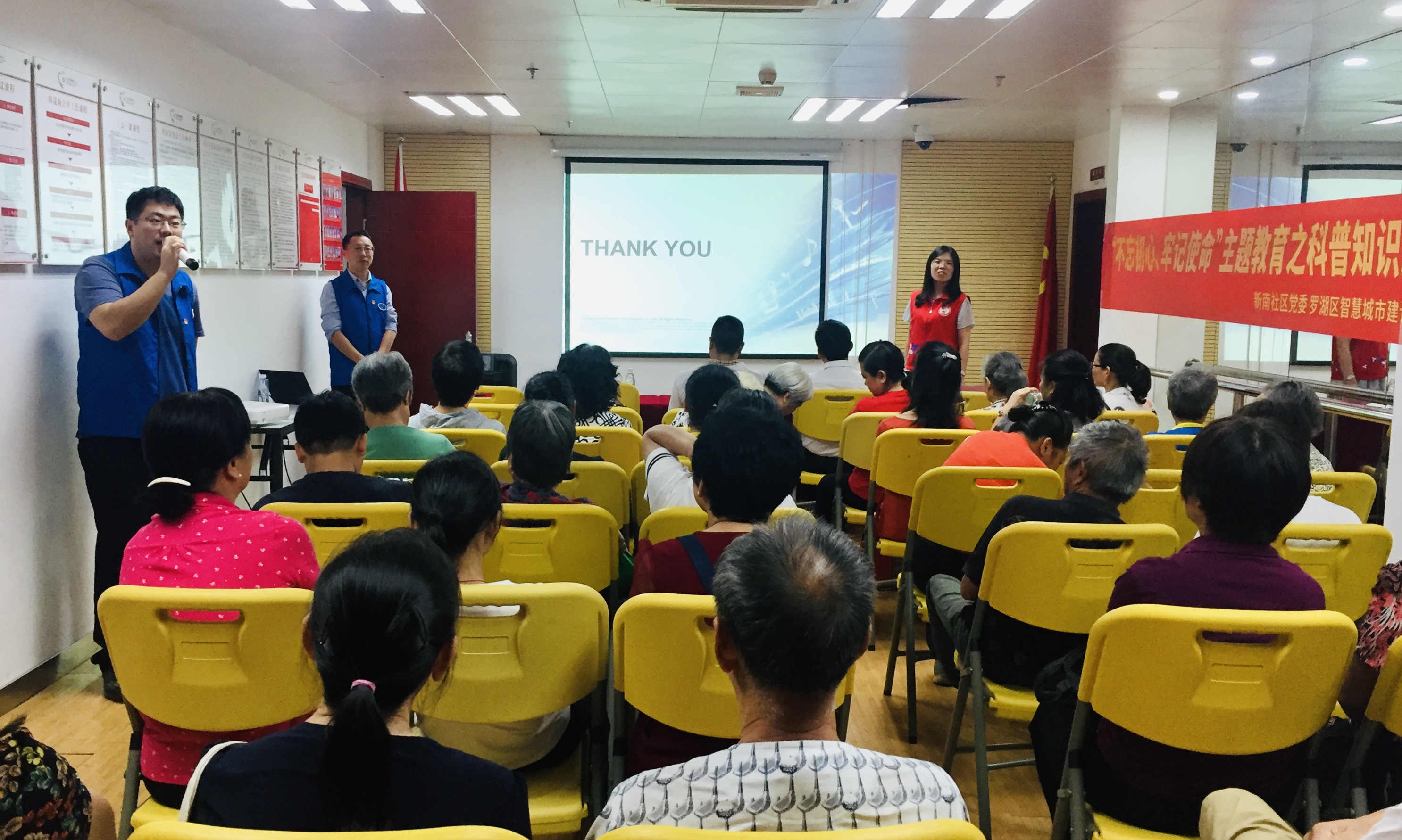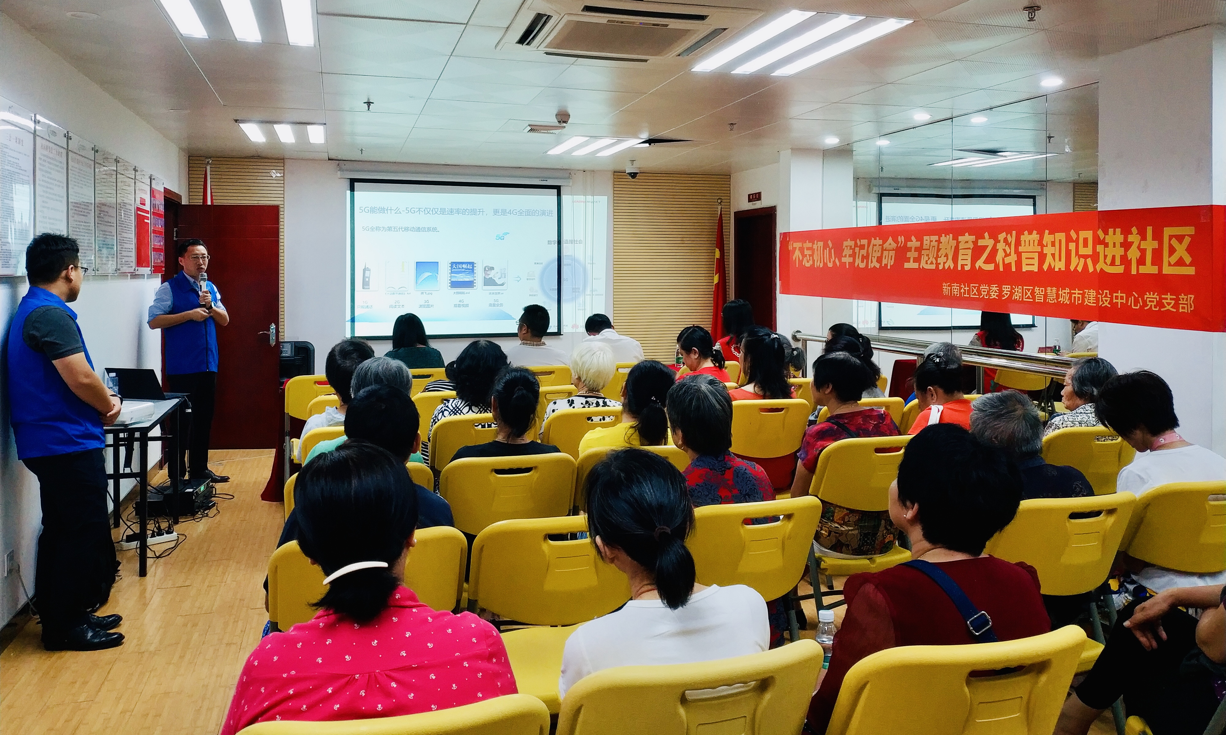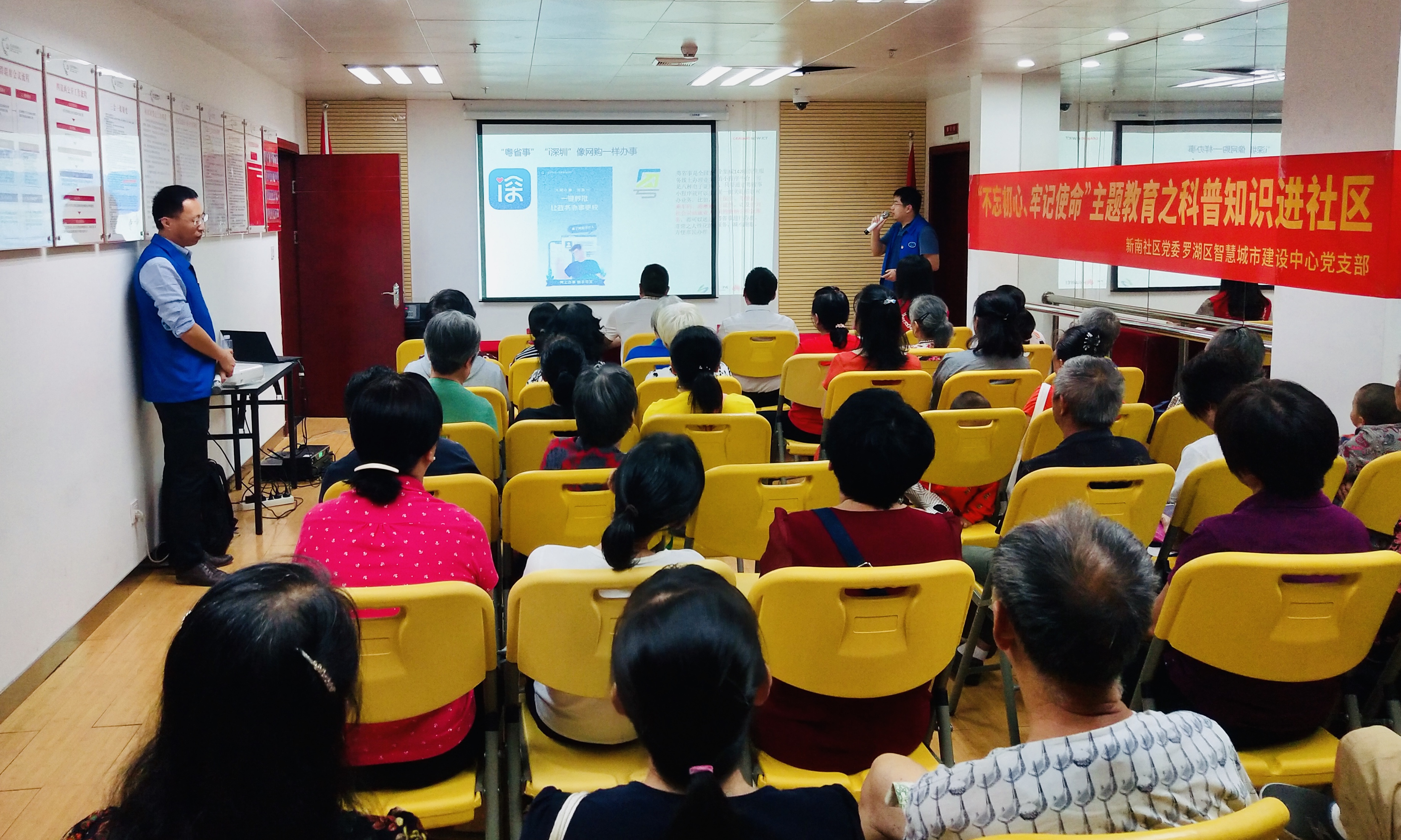 新南社区讯,为深入学习贯彻习近平总书记关于“不忘初心、牢记使命”主题教育的重要讲话和指示精神,扎实开展主题教育,新南社区党委根据社区居民对科普知识的需求,主动对接罗湖区智慧城市建设中心党支部,于9月29日下午在新南社区党群服务中心联合开展科普知识进社区活动。罗湖区智慧城市建设中心五级职员黄少龙、中心副主任罗庆、南湖街道副调研员、社区第一书记王惠等领导出席,罗湖区智慧城市建设中心党支部党员、新南社区党员、居民共50余人参加。社区党委书记苏媛媛主持了活动,王惠同志代表街道对区智慧城市建设中心送服务到社区表示热烈和衷心感谢,希望双方能够在此次共建的基础上探索更多的共建方式和共建内容,更好地服务辖区单位和社区居民。黄少龙同志从服务社区、服务居民的角度阐释了此次活动的意义,对新南社区党委的共建倡议给予了高度评价。