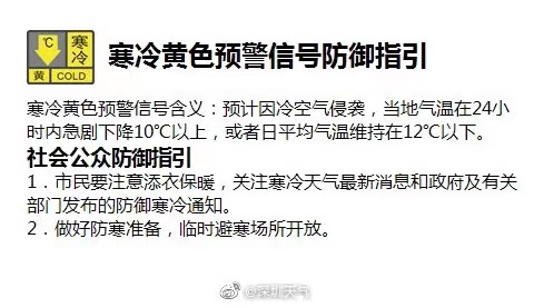 【深圳市寒冷黄色预警】深圳市气象台于2020年12月14日12时00分在全市陆地发布寒冷黄色预警。受较强冷空气影响,预计15-16日最低气温将降至10-11℃,信号可能持续2-3天,其中14-15日沿海、高地和海区最大阵风7级。我市(含深汕区)森林火险橙色预警信号生效中,请注意防风、防寒,谨防一氧化碳中毒,并继续注意用火用电安全。市、区两级救助站避寒场所开放,有需要的市民可前往,地址及联系电话可通过12345电话查询。