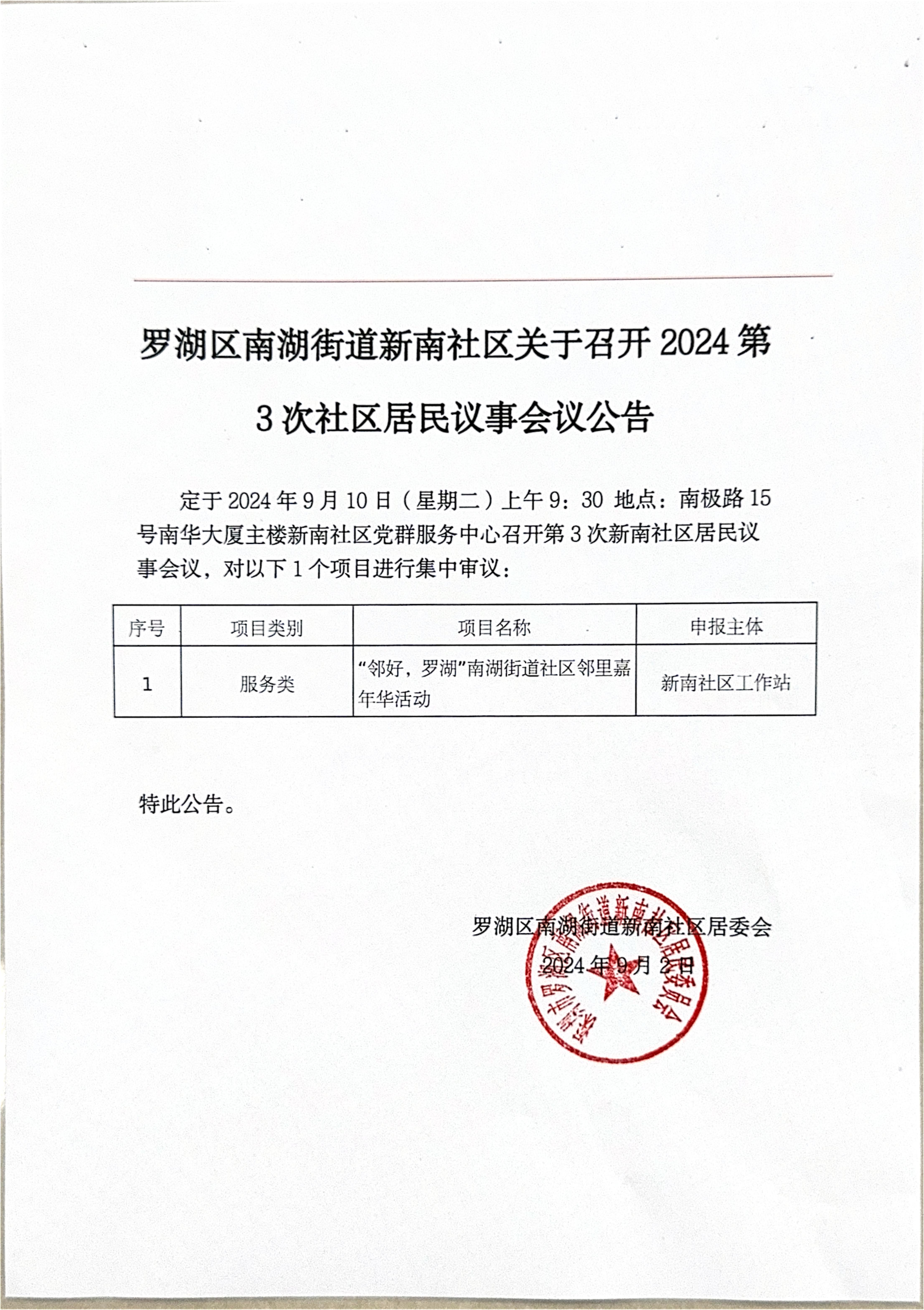 罗湖家园网讯:罗湖区南湖街道新南社区关于召开2024第3次社区居民议事会议公告