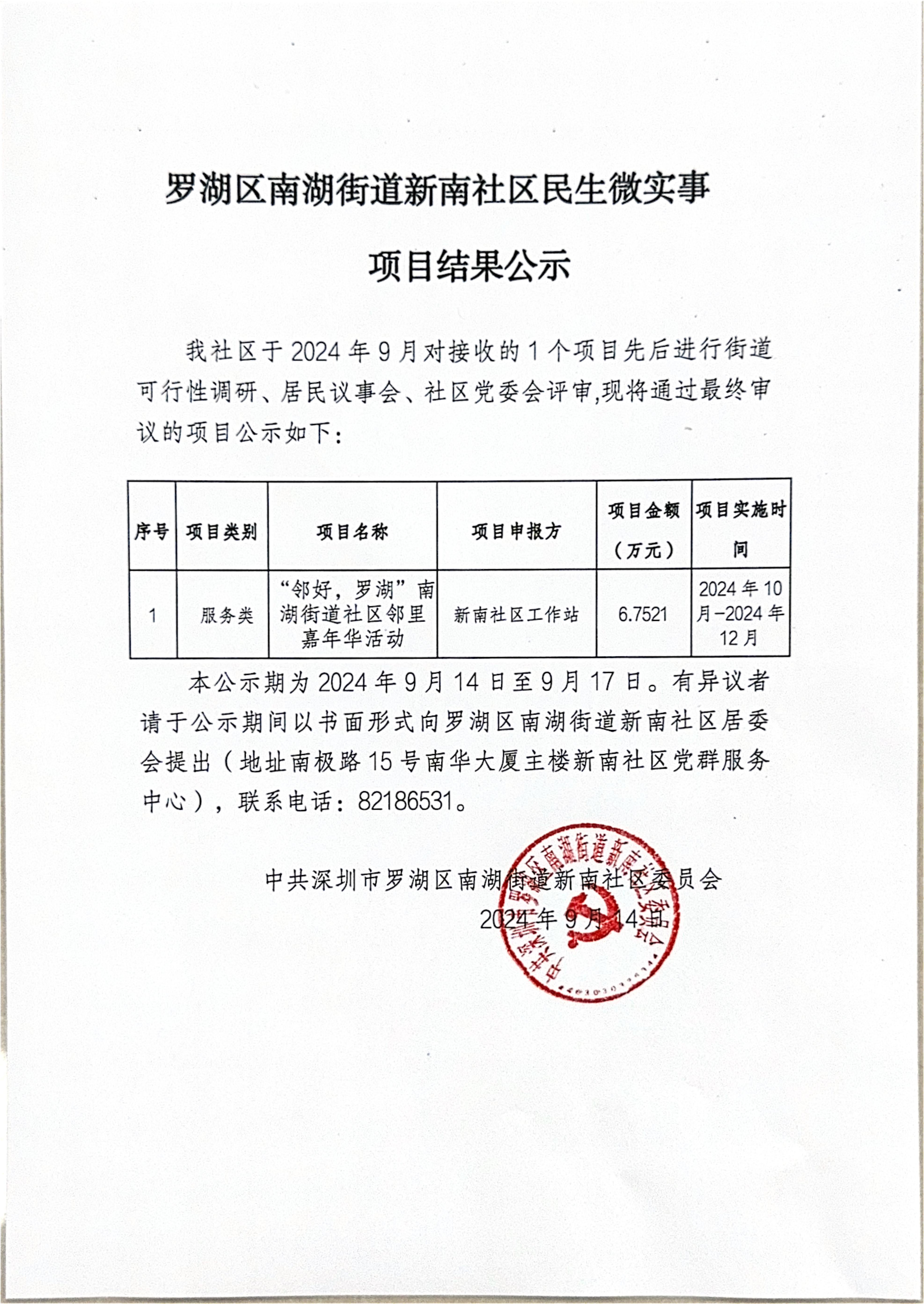 罗湖区南湖街道新南社区民生微实事项目结果公示