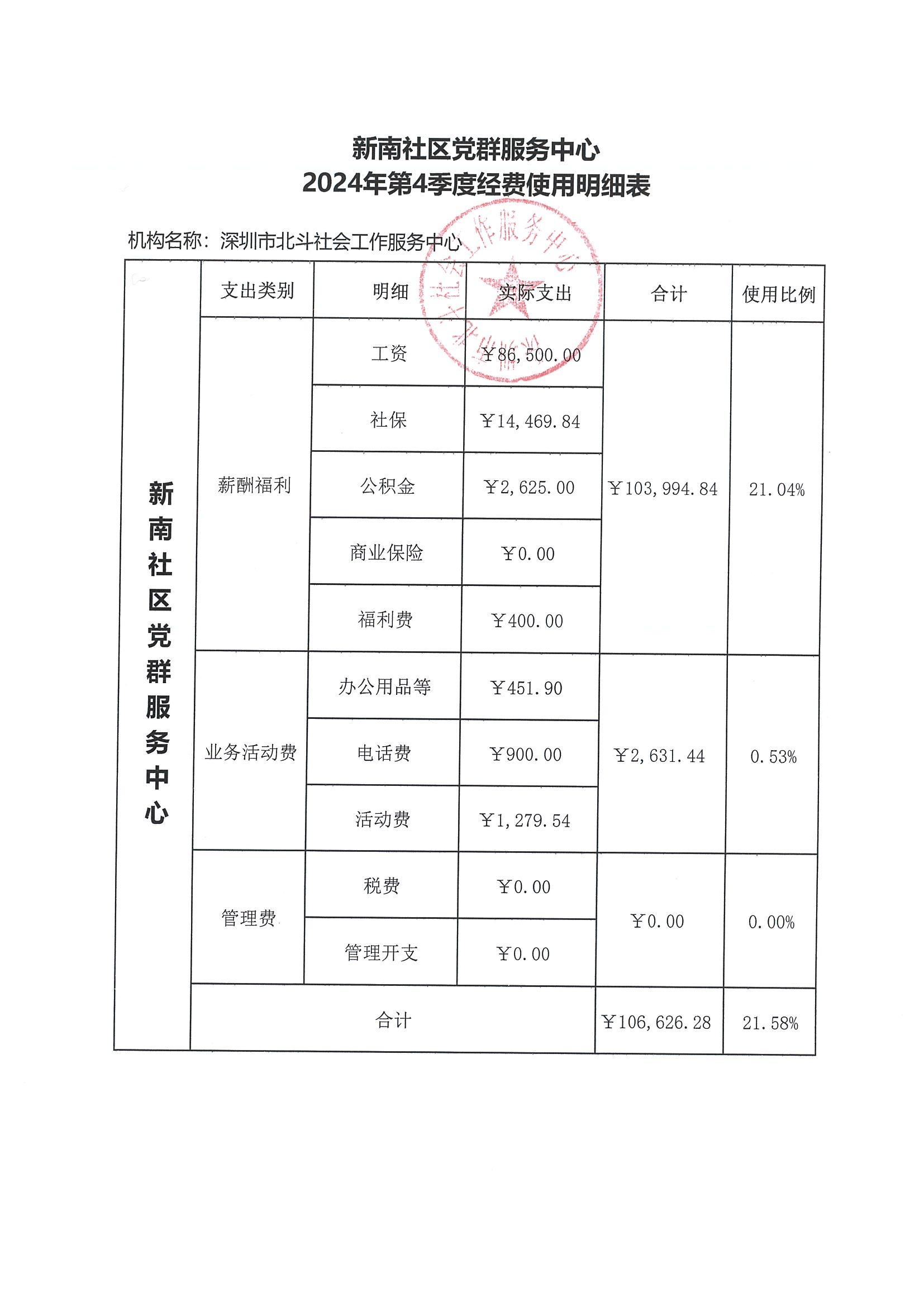 罗湖家园网讯:新南社区党群服务中心2024年第4季度经费使用明细表