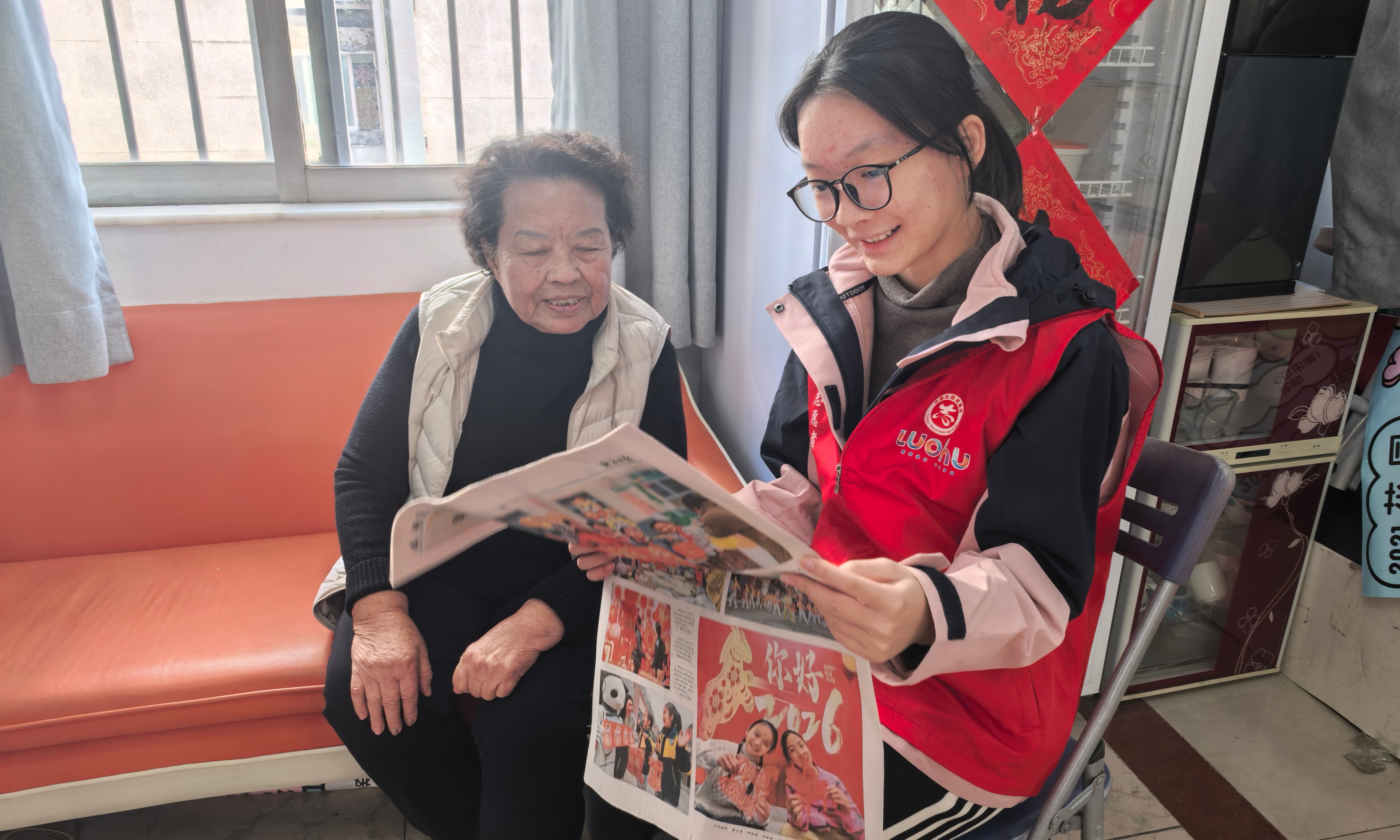 合唱结束后,青少年志愿者们分工明确、有条不紊地展开服务。部分志愿者主动拿起扫帚、抹布,认真清扫地面,仔细擦拭桌椅、窗台等角落,不放过任何一处灰尘,用汗水为长者们打造整洁舒适的活动环境;另一部分志愿者则围在长者身边,轻声朗读涵盖时事新闻、民生政策、健康常识的报纸,耐心倾听长者讲述过往经历,陪他们唠家常、话冷暖,现场氛围温馨融洽。