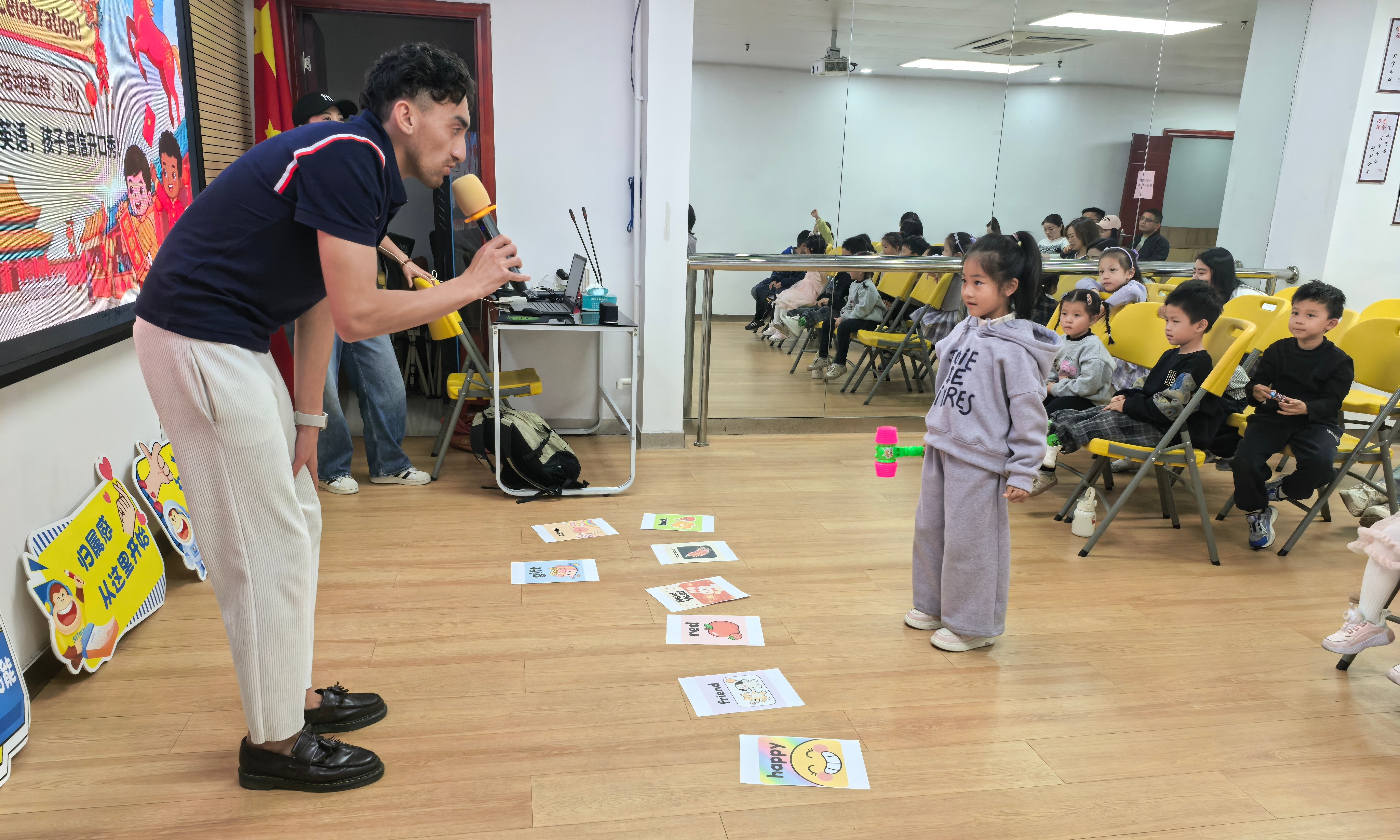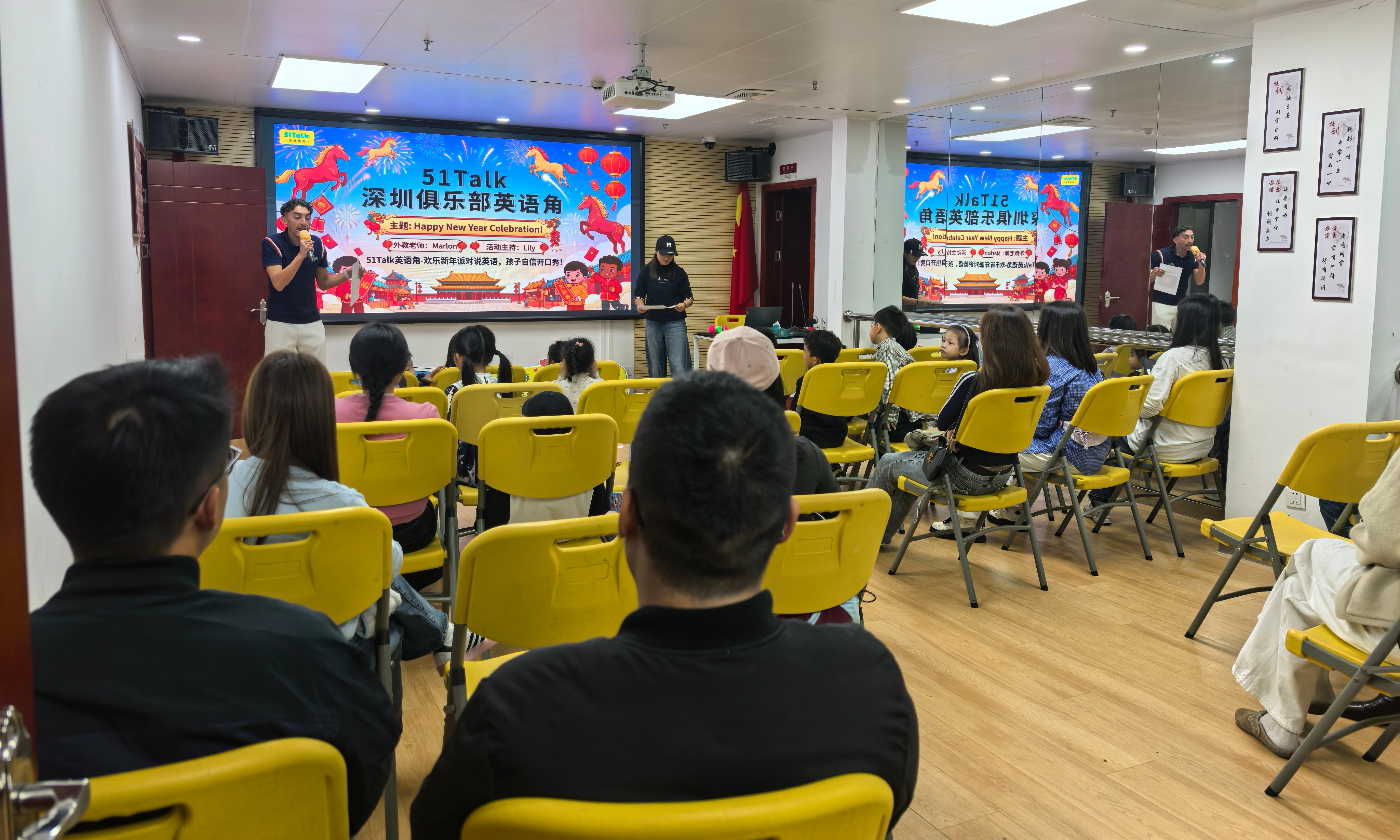 活动现场年味十足,红灯笼、彩气球与英文新年贴纸相映成趣。深圳俱乐部的老师化身“新年向导”,通过英文儿歌律动、卡通动画片段赏析等环节,让孩子们快速融入氛围。“新年词汇大转盘”“英语祝福接龙”“生肖马英文绘画”等互动游戏轮番登场,小朋友们在游戏中积极举手、大胆表达。这一系列互动环节让孩子们在游戏中轻松掌握新年相关英语词汇与句型,现场洋溢着欢乐与温馨。