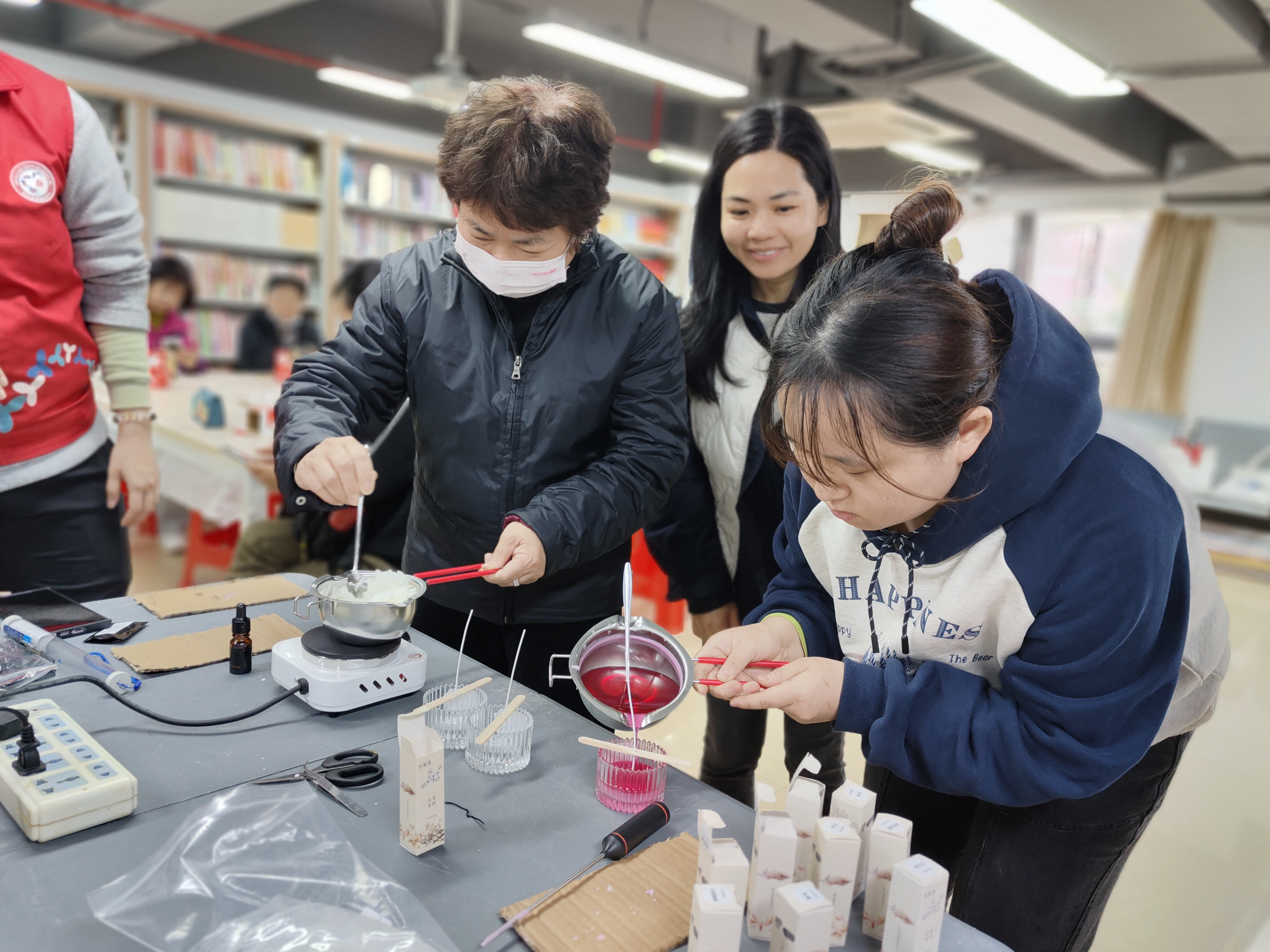 随后,进入令人期待的香薰蜡烛手工制作环节。在社工的耐心指导下,大家充分发挥自己的想象力和创造力,挑选喜欢的容器、蜡材和精油,小心翼翼地将蜡液加热、调色、添加精油,再倒入精心准备的容器中,放入烛芯。等待蜡烛凝固的过程中,大家相互交流制作心得,分享生活趣事,现场欢声笑语不断。