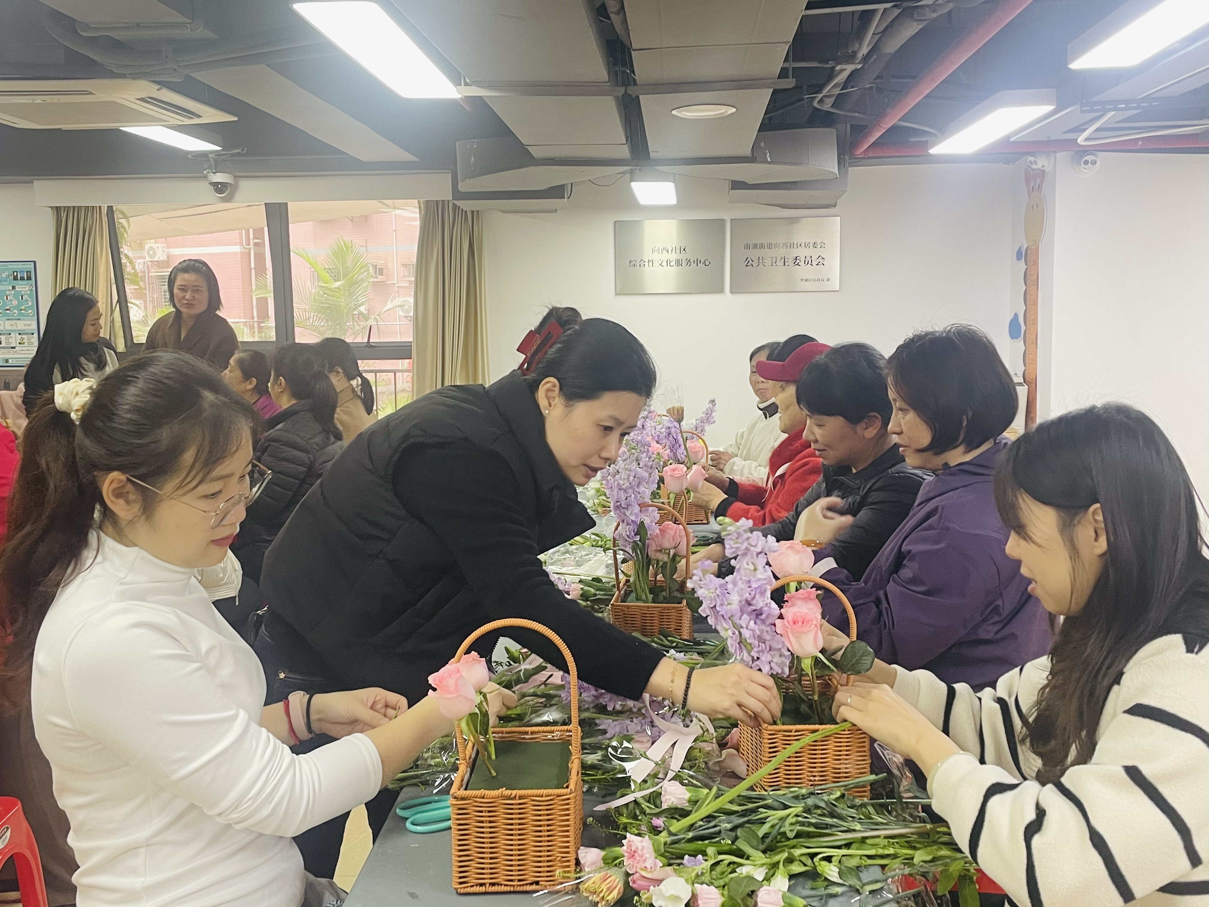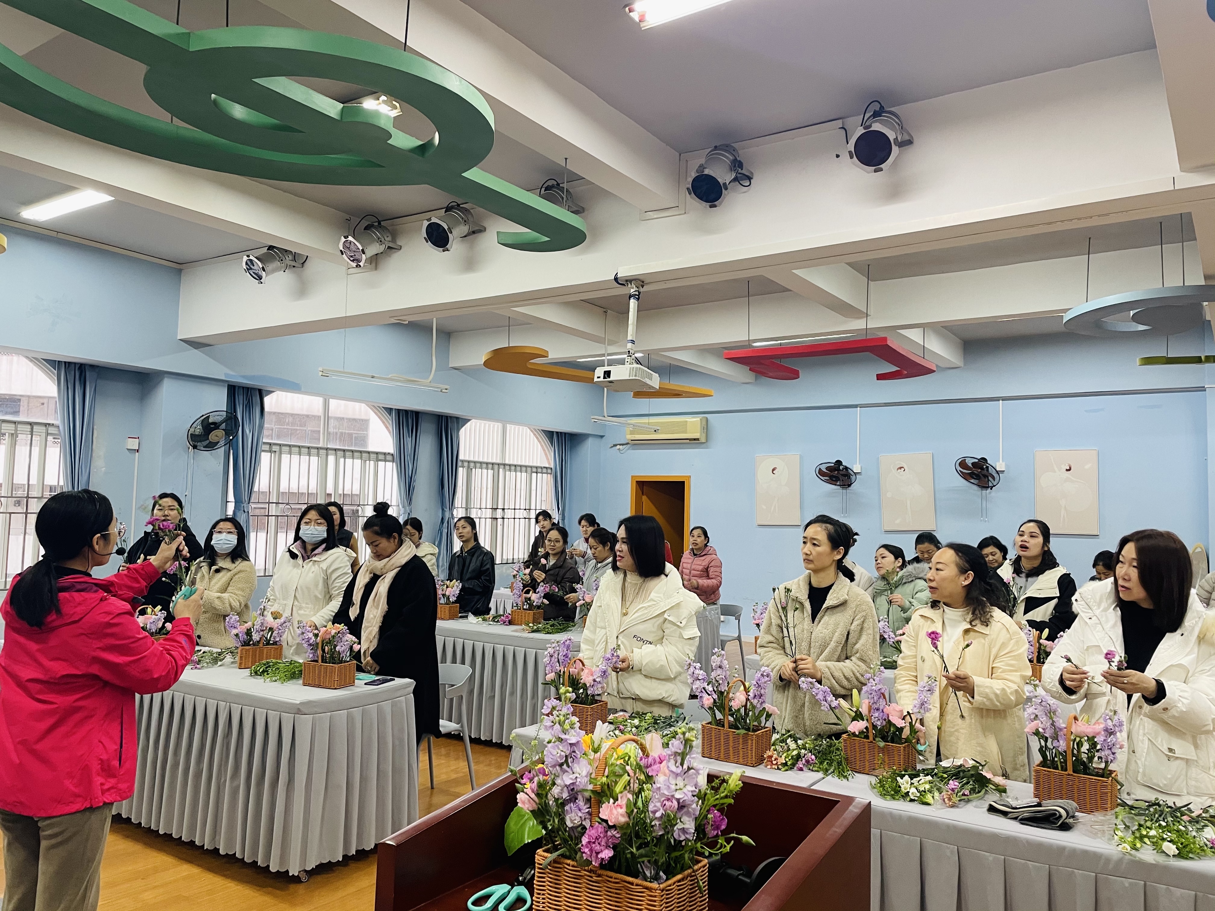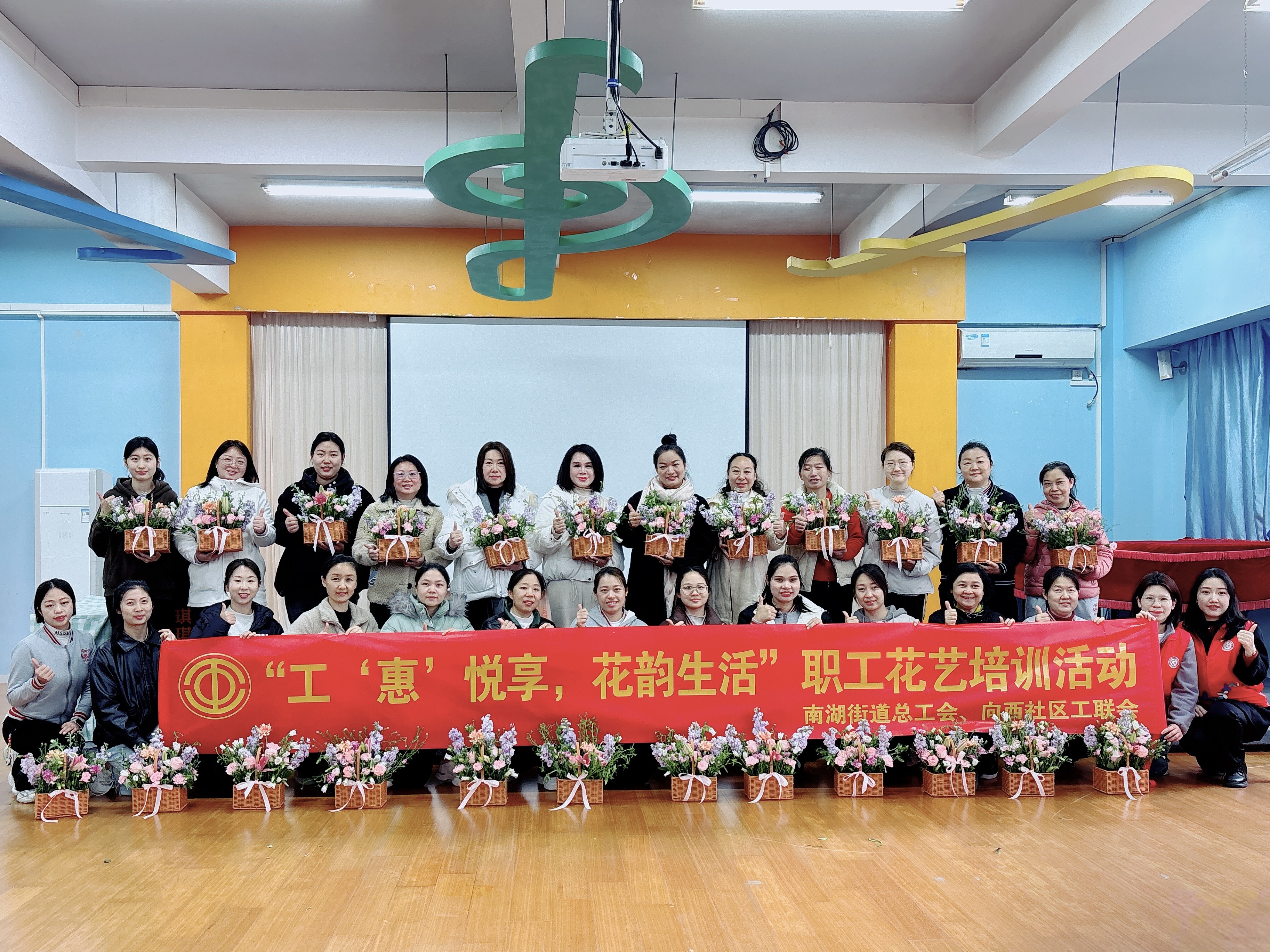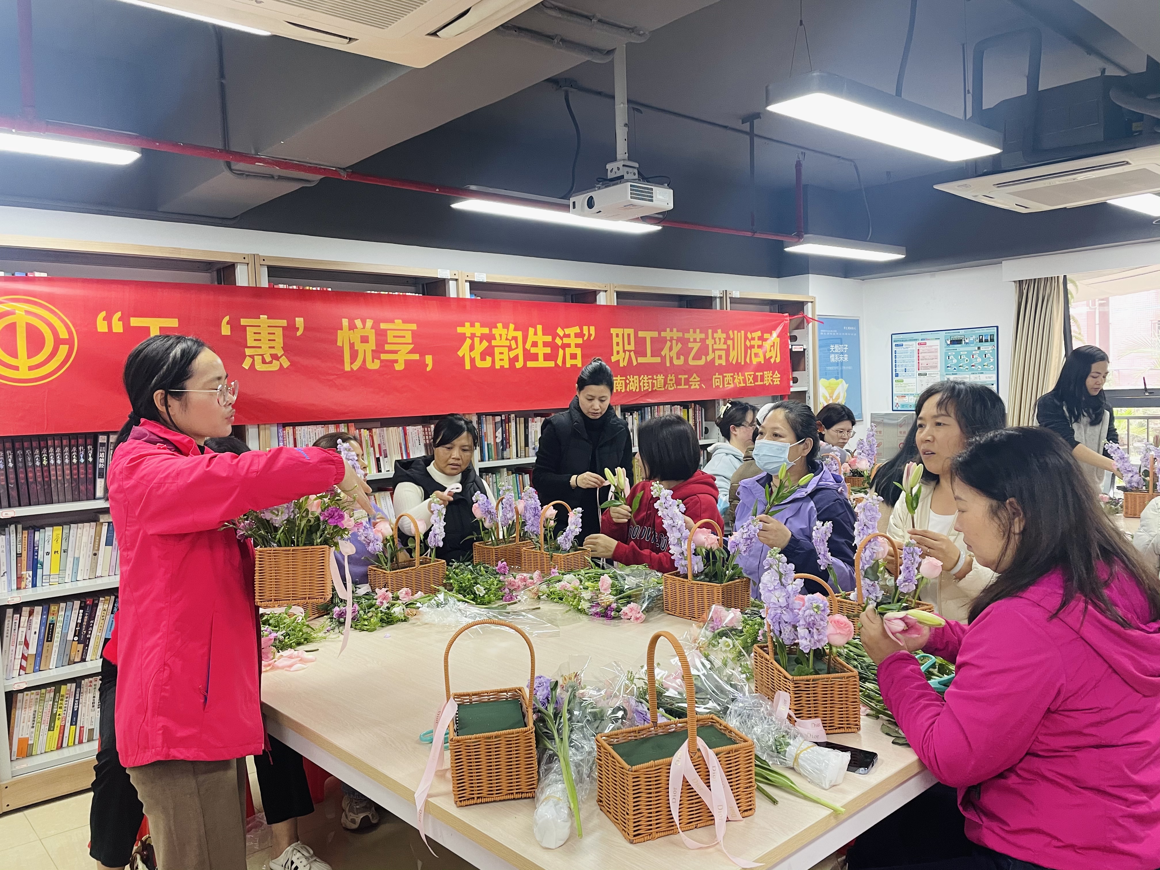 罗湖家园网讯:为庆祝“三八”国际妇女节,提升辖区女职工内涵修养与艺术品位,营造良好的工会服务氛围,在南湖街道总工会的支持下,向西社区工联会于3月6日分别开展3场“工‘惠’悦享·花韵生活”职工花艺培训活动,本次活动共计90名女职工参加,在馥郁花香中共度节日美好时光。