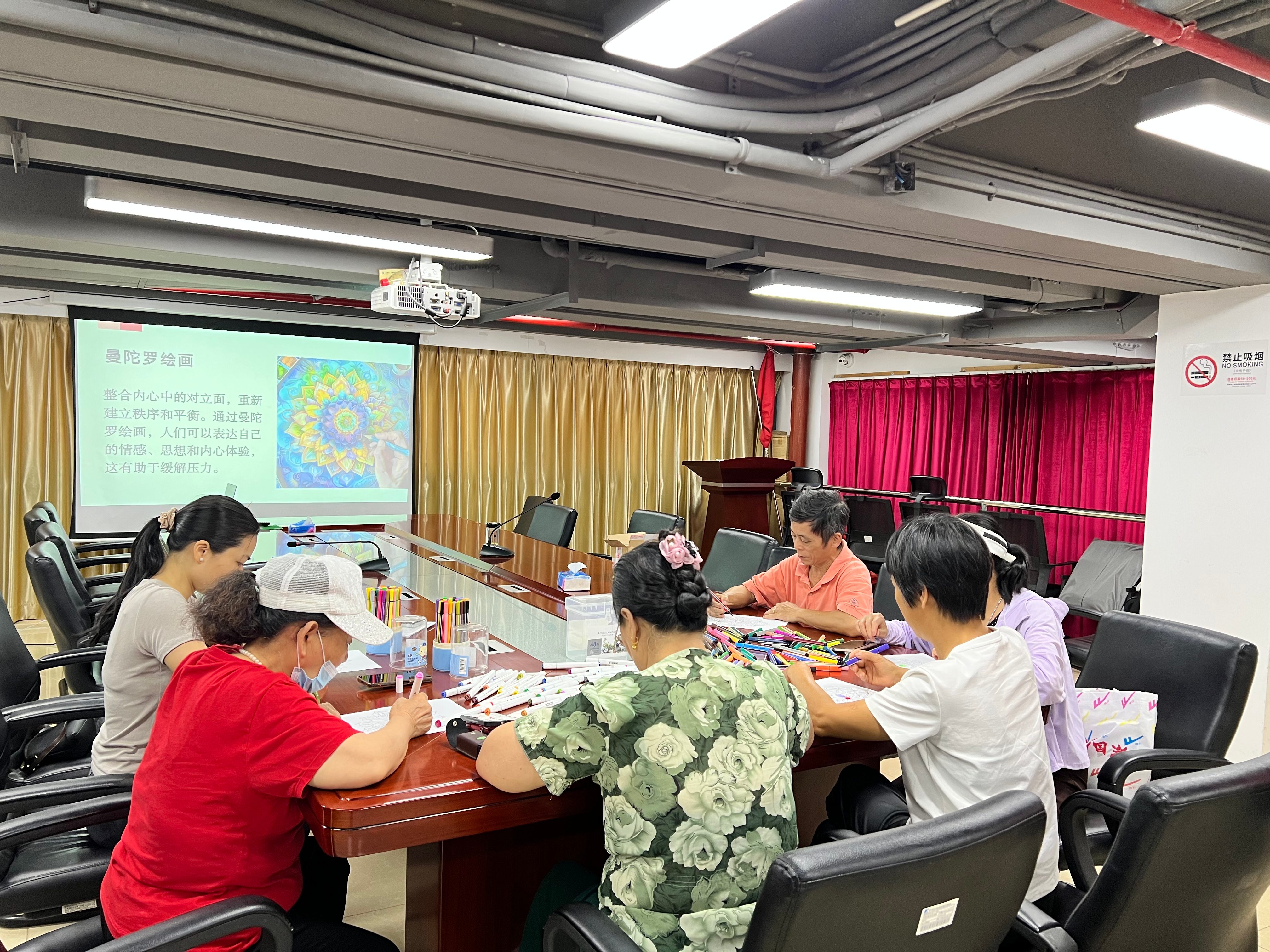 小组后期,社工将正念呼吸训练与曼达拉绘画结合,引导组员通过专注的线条勾勒与色彩填充,平复焦虑情绪。小组的最后,组员们围坐分享参与感受,一起回顾五节课的学习历程。组员王大哥表示:“这些方法简单又实用,不仅缓解了日常压力,也让我更有信心继续服务社区。”