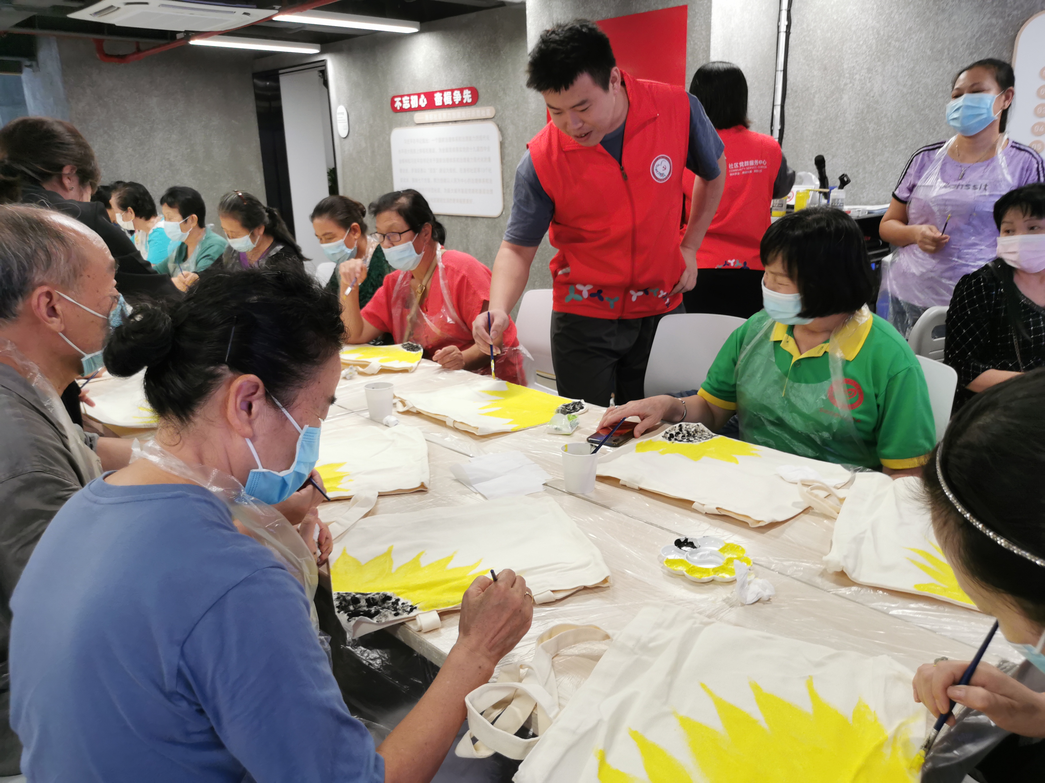本次活动中,工作人员首先带领社区老人家通过观看重阳节相关的视频来认识重阳节,在观看视频的过程中,参与人员聚精会神,生怕错过每一个认识传统节日的瞬间。通过视频学习,老人家了解到原来古人会在重阳节登高祈福、佩插茱萸及拜神祭祖的知识。为了深入了解重阳节的相关习俗,工作人员带领老人家通过手工DIY的方式来制作一个帆布袋,在工作人员和志愿者的耐心指导下,老人家用画笔在帆布袋上进行DIY临摹,出现一朵朵漂亮的茱萸,然后再给茱萸涂上颜色,一个个漂亮的DIY帆布袋就完成啦。