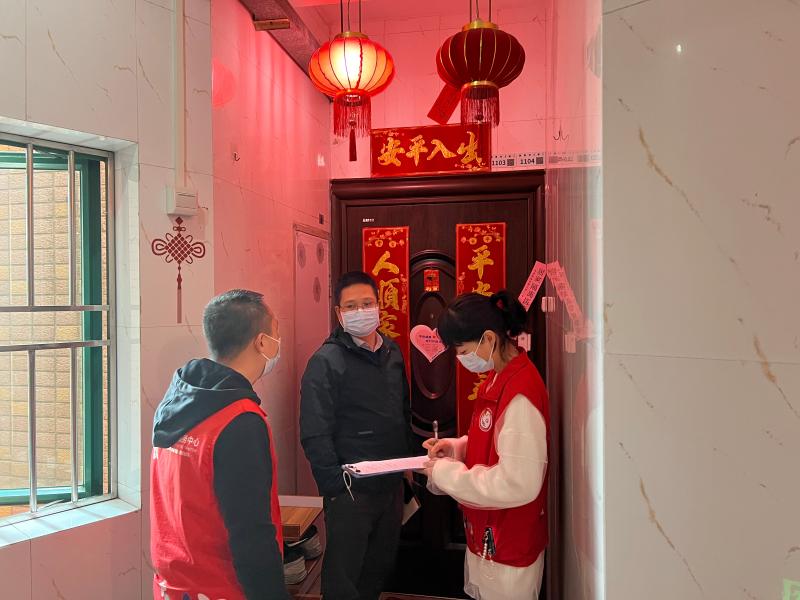 渔邨社区党委书记李竞,副书记史庆明对隔离户进行巡查签到
