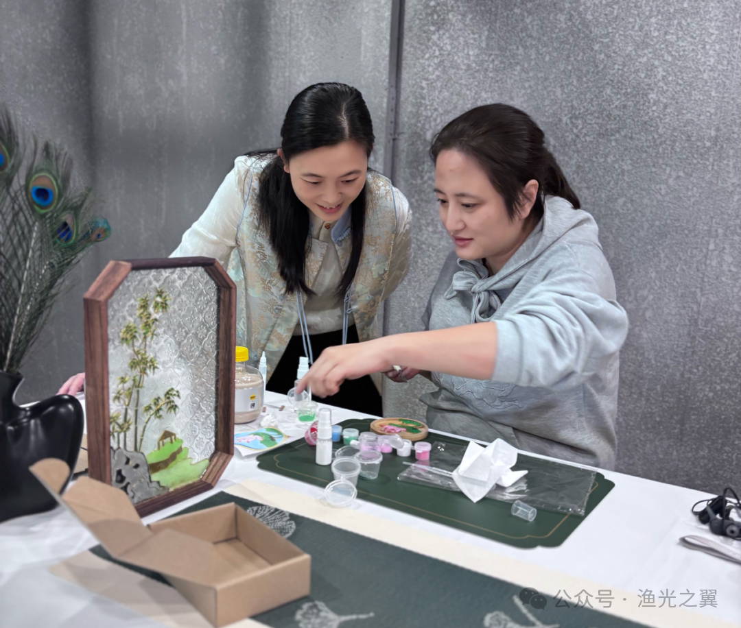 第二场“点蓝”环节,橙、蓝、绿等彩砂相映成趣,参与者带着首场基础调试胶砂更娴熟,彩砂沙沙声与工具脆响交织。课堂上,老师俯身指导操作要点,邻座分享“先填边缘再铺中间”等诀窍,20人默契协作,让非遗充满暖意。