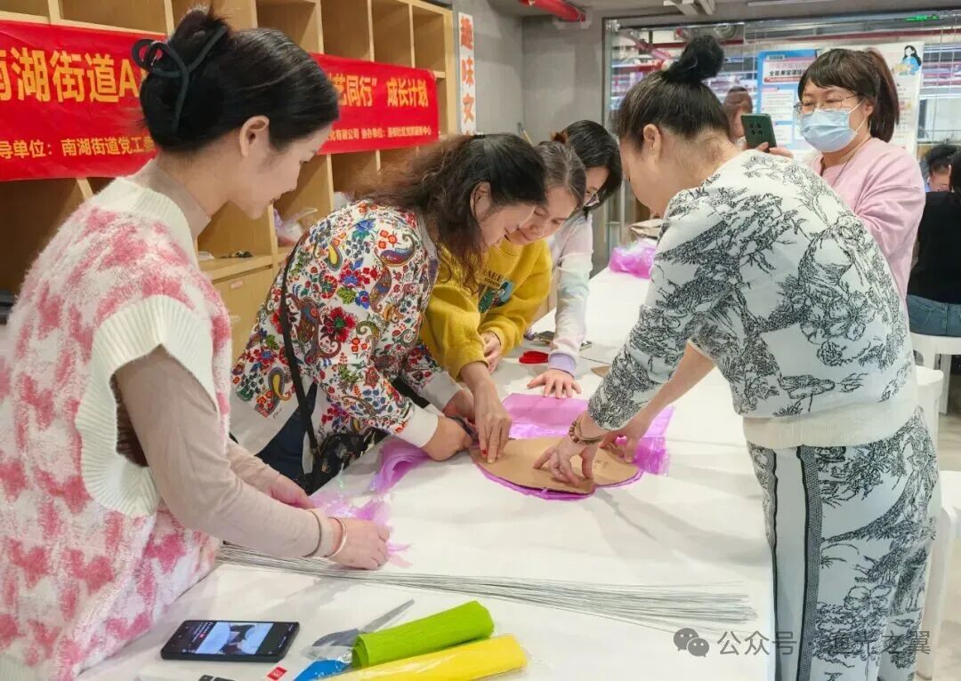 活动现场,大家分工明确、默契十足,呈现出热火朝天的创作景象。有的专注裁剪皱纹纸、欧根纱等核心材料,精准复刻花瓣纹理;有的手持热熔枪细心塑形,有的默契配合固定花杆、组装花型,不放过任何细节。