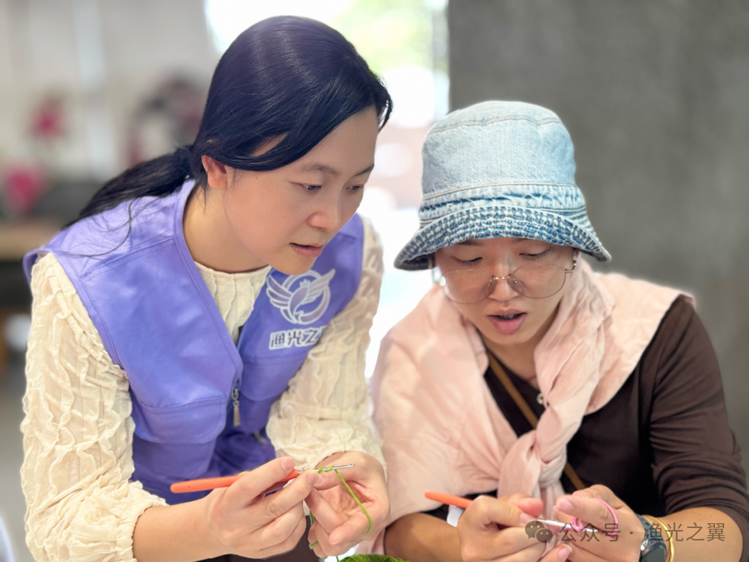 遇到难题时,学员们相互请教、彼此鼓劲,老师则穿梭在人群中逐一指导,活动室满是互助友爱的温馨氛围。从生疏地勾错线环,到熟练地掌握节奏,每个人都在不断尝试中步,指尖的彩线渐渐勾勒出四叶草的灵动轮廓。