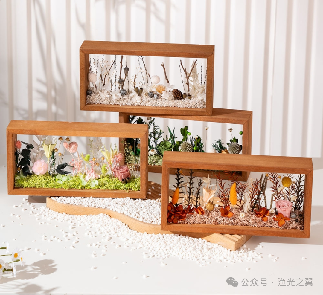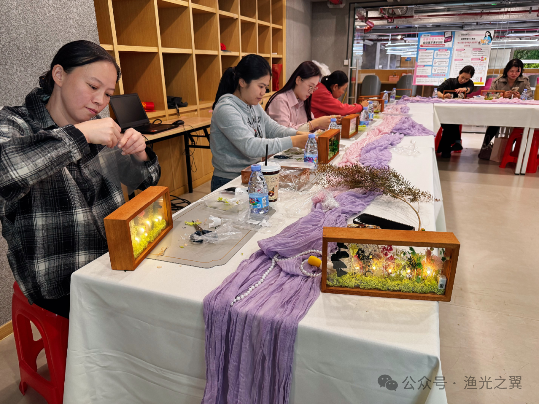 罗湖家园网讯: 今天,渔邨社区“工‘惠’悦享 ‘渔’你相伴”职工舒压减压手作活动温情启幕,近20名职工齐聚一堂,沉浸式体验永生花微景观创作乐趣,最终完成了缀着灯串的“春、夏、秋、冬”四款主题精致相框作品。