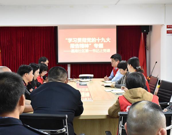 2018年1月2日下午,嘉南社区第一书记张丽华在多功能会议室开展“学习贯彻党的十九大精神”专题党课学习。宣传贯彻十九大精神。社区党委班子成员、各支部委员参加了此次学习。