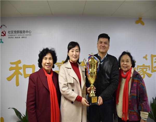 新年新气象,新路程,嘉南社区老年人协会于新年开工之际将2017年“天浩杯”深圳市社区健身秧歌、腰鼓及手拍鼓大赛中,嘉南社区秧歌代表队获得金奖的奖杯送至嘉南社区,又为嘉南社区增添一份荣誉。