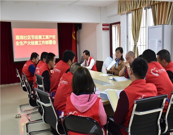 2018年2月26日下午,嘉南社区党委书记、工作站站长张宇组织社区工作人员召开了嘉南社区年后复工复产安全生产大检查部署会。