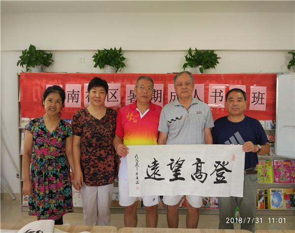 7月31日上午,嘉南社区暑期成人书法培训班在社区图书室举行结业礼。罗老师现场挥毫泼墨为学员赠送题词,勉励学员“学无止境”、“登高望远”。一个月来7节课程的学习,时间虽短,但学员们的书法水平都有了不同程度的提高,收获颇丰。