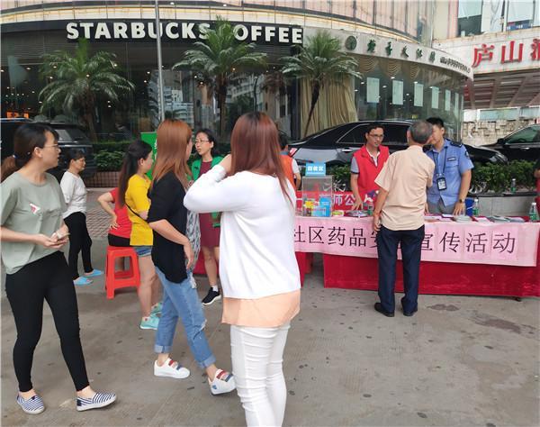 为了普及辖区居民的安全用药知识,嘉南社区党委、居委会、服务中心于8月16日在庐山酒店门口,开展了药品安全宣传活动。
