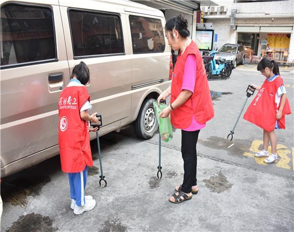 活动中,社区志愿者们将人行道上的烟头、纸巾等垃圾捡起来,并将乱摆放和倒地的共享单车摆放整齐,防止在台风来临时阻碍人行通道,同时劝导共享单车使用者自觉按照规定停放单车,志愿者服务活动得到了路人的肯定和点赞。