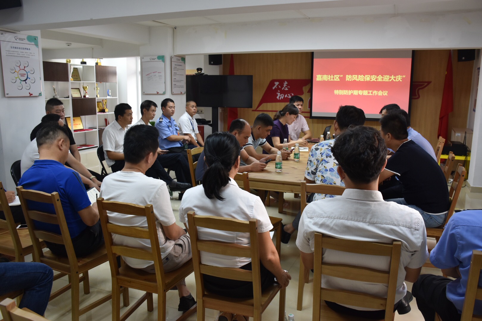嘉南社区讯,9月24日下午,为做好特别防护期攻坚阶段的安全防护工作,嘉南社区工作站召开“防风险、保安全、迎大庆”特别防护期安全隐患排查专题整治会议,对特别防护期及国庆节节前安全工作进行再部署。南湖派出所副所长陈剑端、社区警务室警长林子光,吴毓成、辖区物业单位及重点单位的负责人参加了本次工作会议。