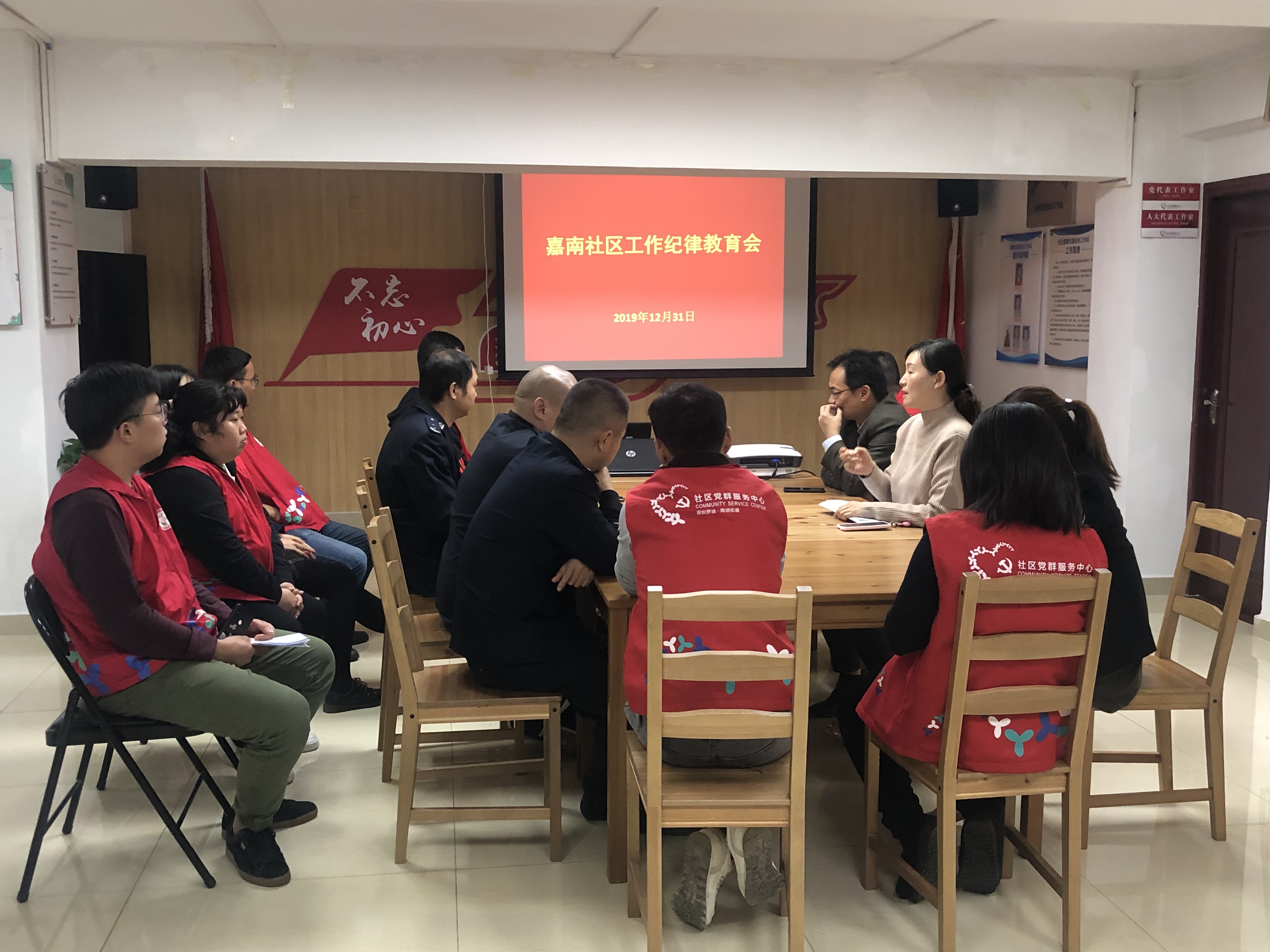 嘉南社区讯,为加强嘉南社区工作队伍管理建设,端正队伍工作态度,整治严明纪律作风,2019年12月31日下午,嘉南社区在工作站会议室召开工作纪律教育会,社区党委书记、工作站站长张宇主持本次会议,全体工作人员出席参加。