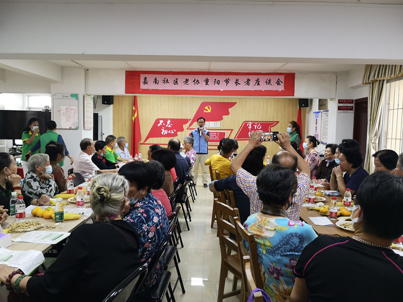 嘉南社区讯,金秋送爽,丹桂飘香。10月21日下午,在九九重阳节来临之际,为弘扬尊老、敬老的中华传统美德,营造尊老、爱老、助老的浓厚氛围。嘉南社区老年人协会在社区三楼会议室举办重阳节长者座谈会活动,邀请了近70名会员代表参加。嘉南社区工作站副站长曾海生出席活动,并发表热情洋溢的讲话。曾副站长向在座的老年朋友,并通过大家向社区所有老年人致以节日的问候和最美的祝愿!座谈会上,长者们欢聚一堂,共度重阳佳节。周琪老师为大家献唱《真诚的美丽》,杨礼贞理事演唱粤曲《平湖秋月》,她们的出色表演赢得场上热烈掌声。最后周琪老师牵头引领大家合唱《我和我的祖国》,此刻,现场气氛达到高潮。座谈会活动时间虽短,但其意义悠长。带出一种信息,老年人需要关爱、需要健康、需要快乐;老年人看重的不是重阳节的礼品,而是人们给予的一声深情的问候。
