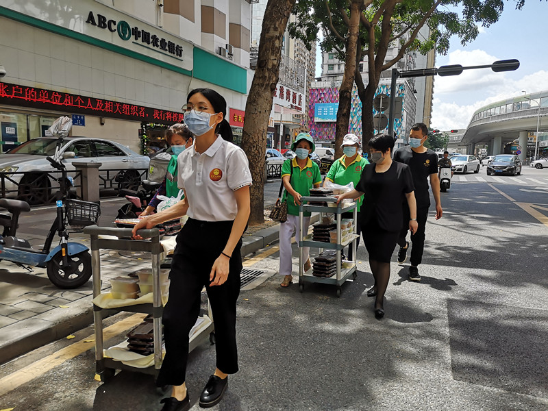 现场派送饭盒完成后,老年志愿者和社工把认领的20多份素食午餐送进居民小区清洁工、保安员、高龄长者的手中。有位长者激动地说:“感谢你们中午高温天气下送来饭盒,饭盒虽然不贵重,但我们感到很温暖。感谢你们这群有爱心的人。”