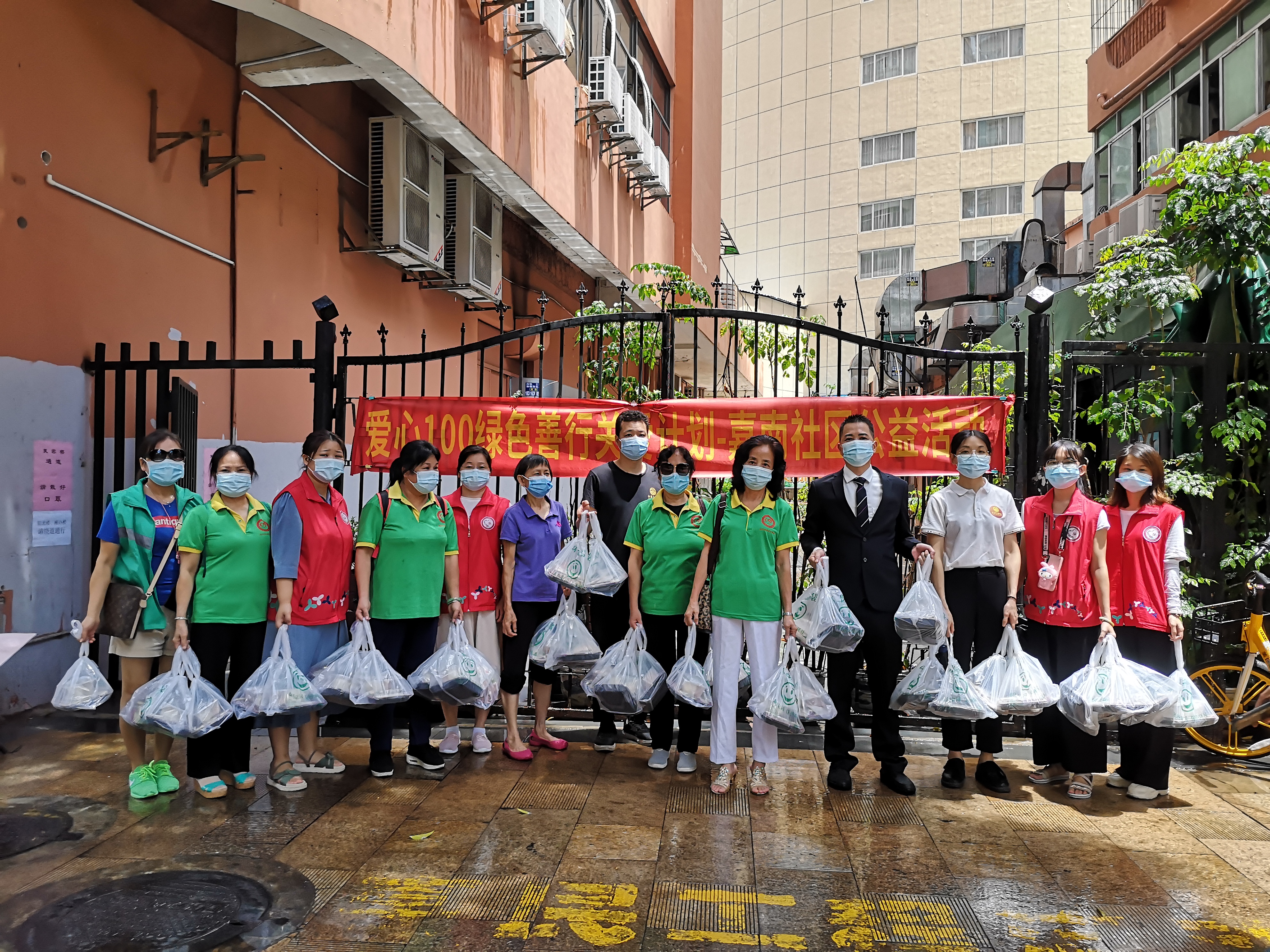 中午时分,10多名老协志愿者和党群服务中心社工提前到达派送点拉起“爱心100绿色善行关爱计划——嘉南社区公益活动”的横幅。又到金碧大酒楼协助酒楼员工护送素食午餐到现场。